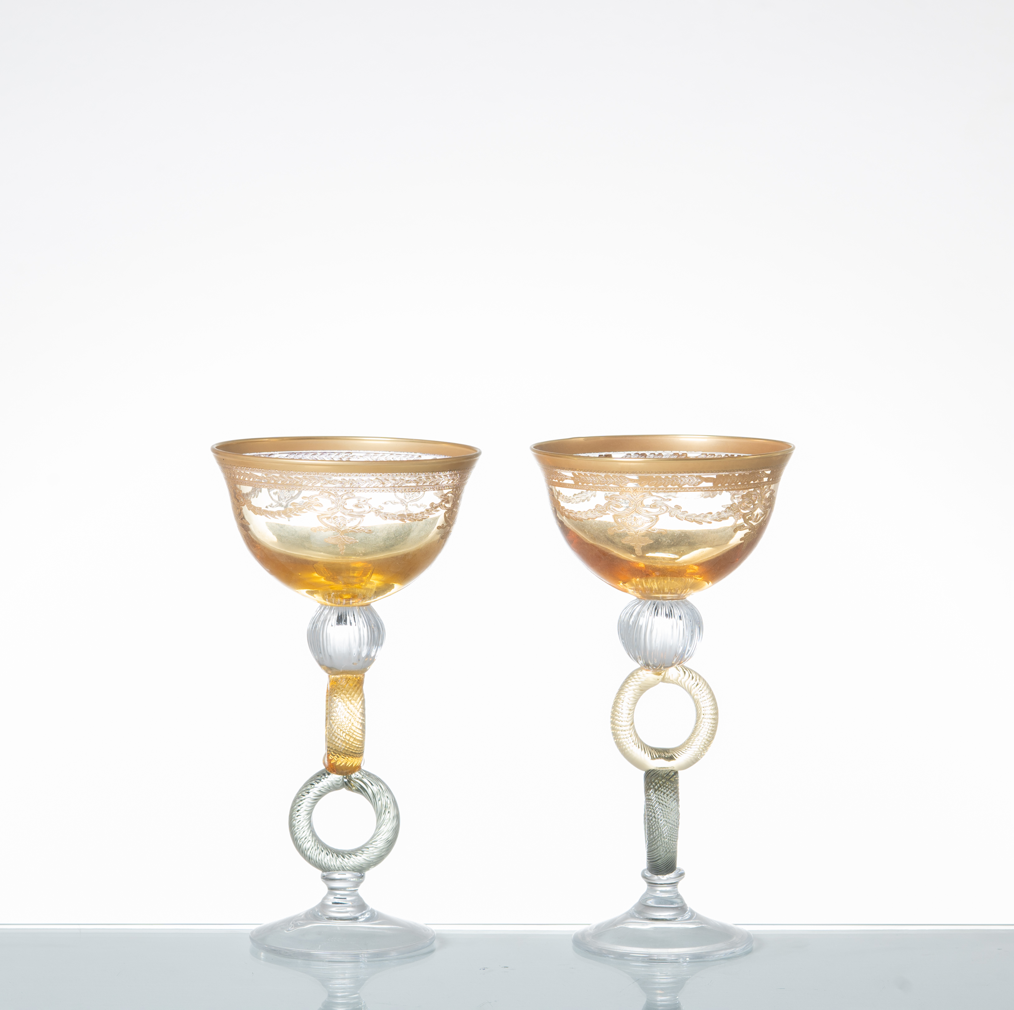 Due calici in vetro soffiato incolore e pagliesco, gambo composto da anelli tortili, coppe incise e decorate in oro con tralci, bocca circolare bordata in oro.