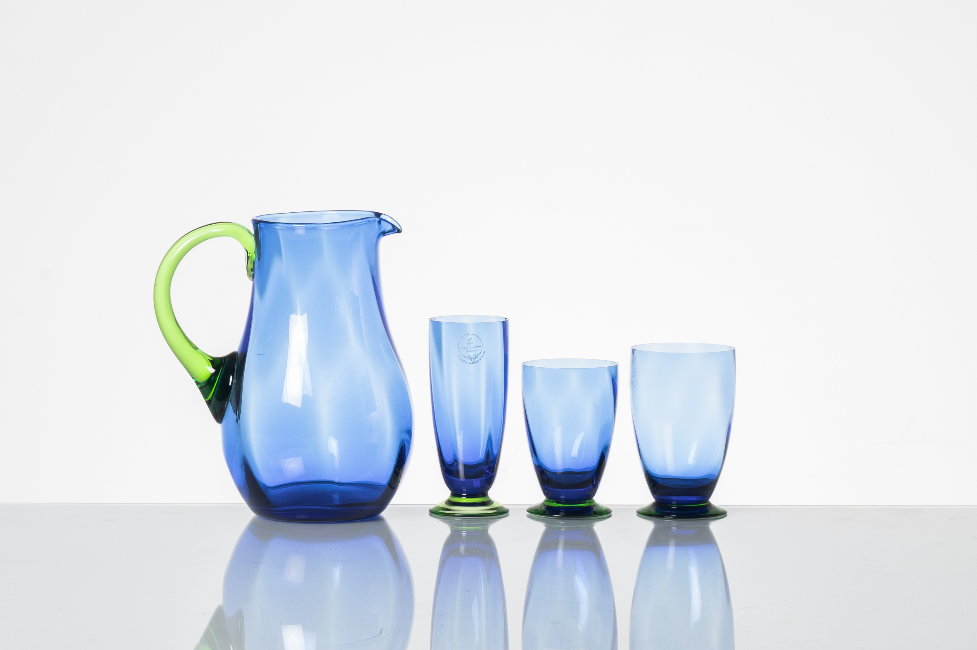 Servizio in cristallo nei toni del blu e verde composto da: brocca, 12 bicchieri acqua, 12 bicchieri vino, 12 flutes.