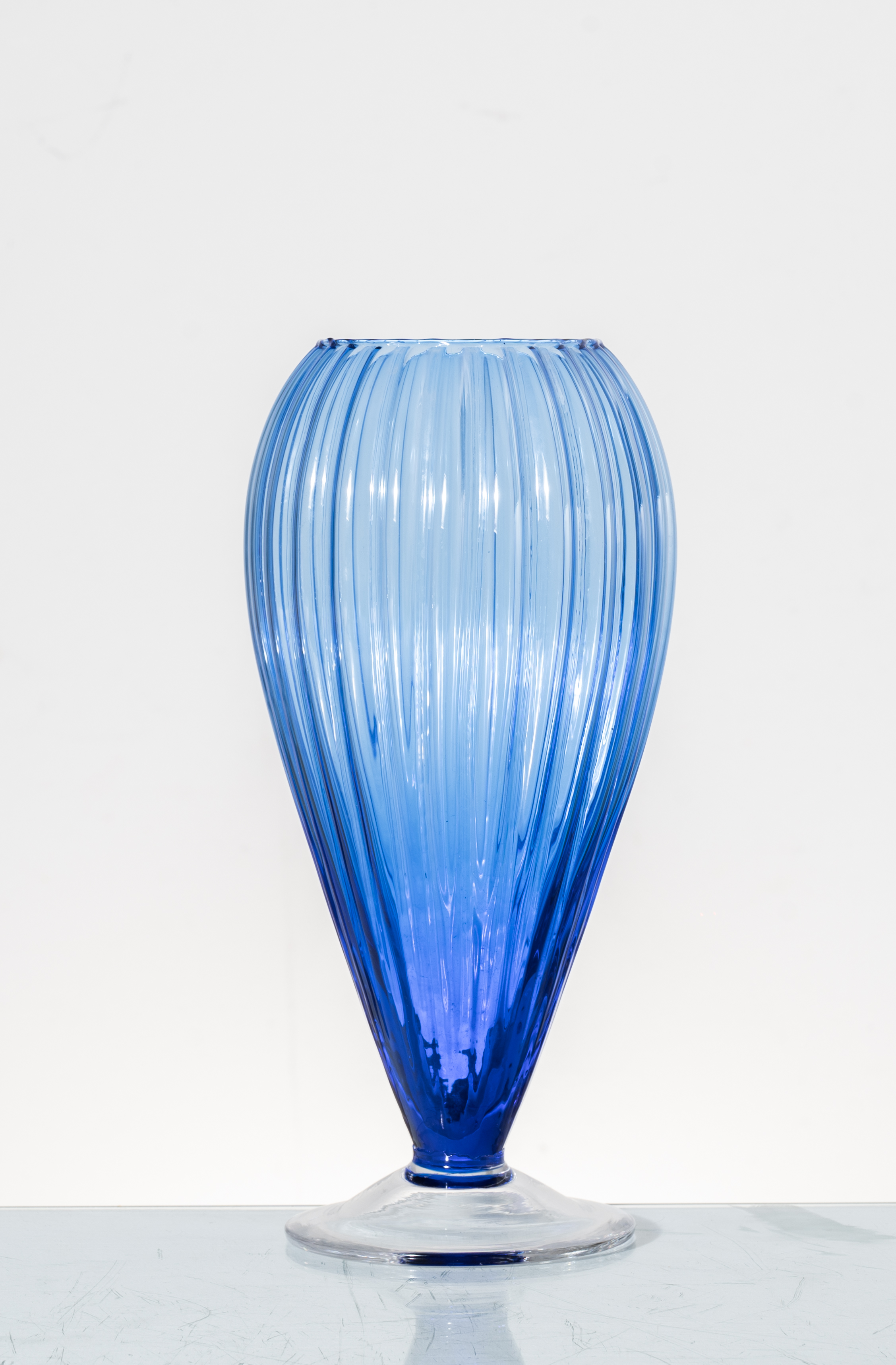 Vaso in vetro nei toni del blu e del trasparente.