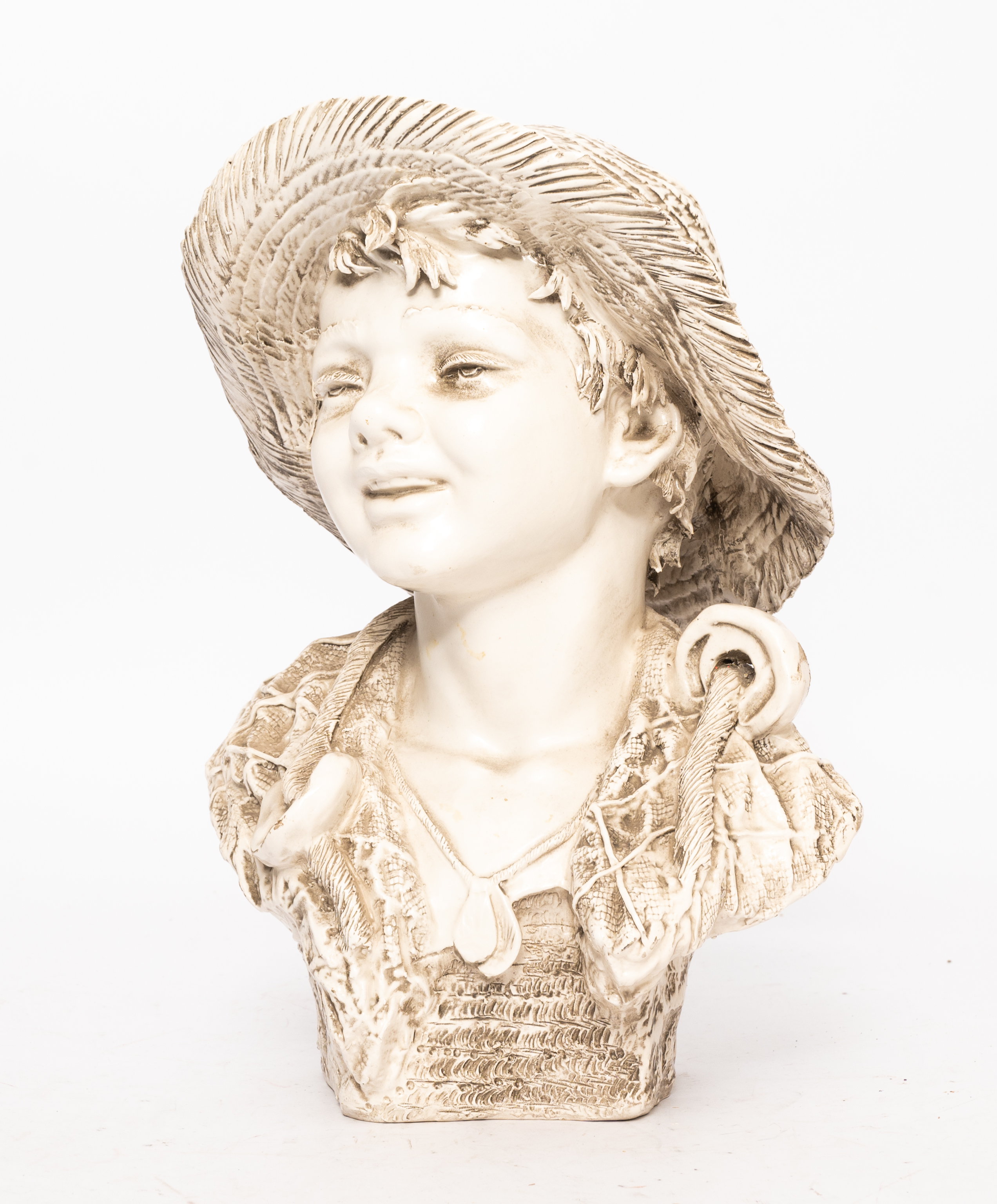 Scultura in ceramica smaltata nei toni del bianco raffigurante "Mezzo busto di scugnizzo".