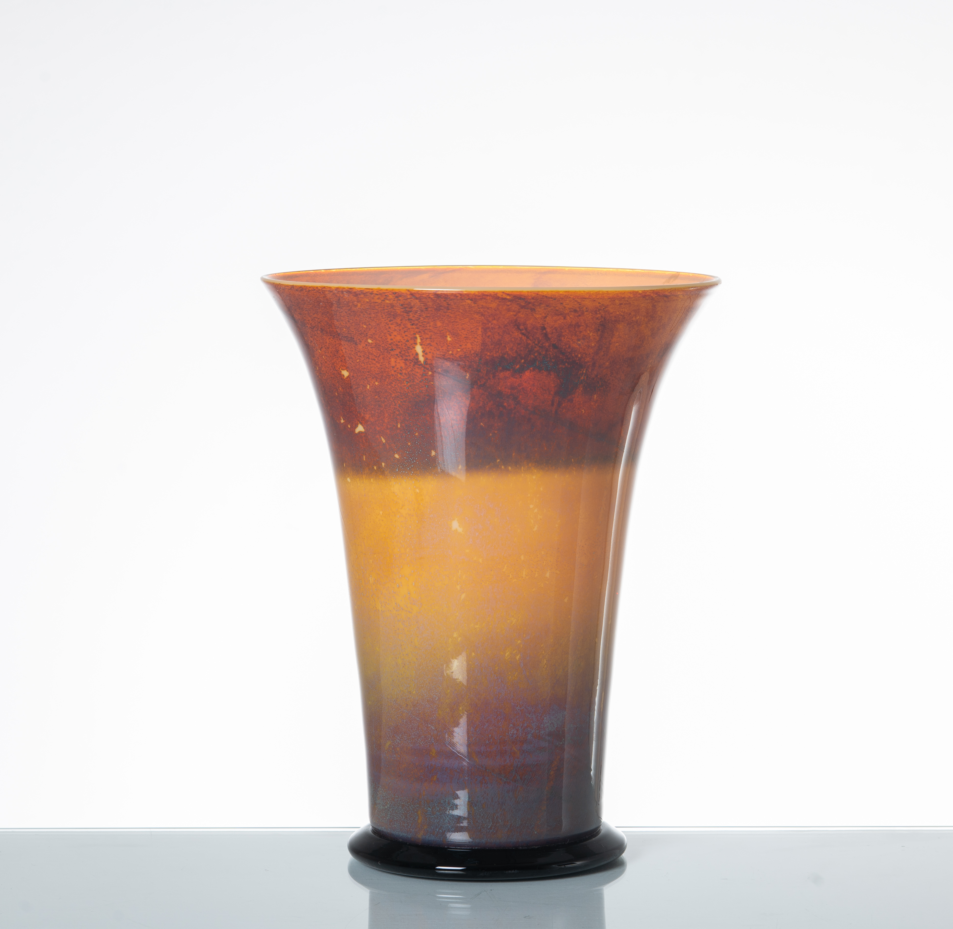 Vaso a tromba in vetro soffiato ocra con ossidazioni a fasce brune, bocca piana circolare, base in vetro nero.