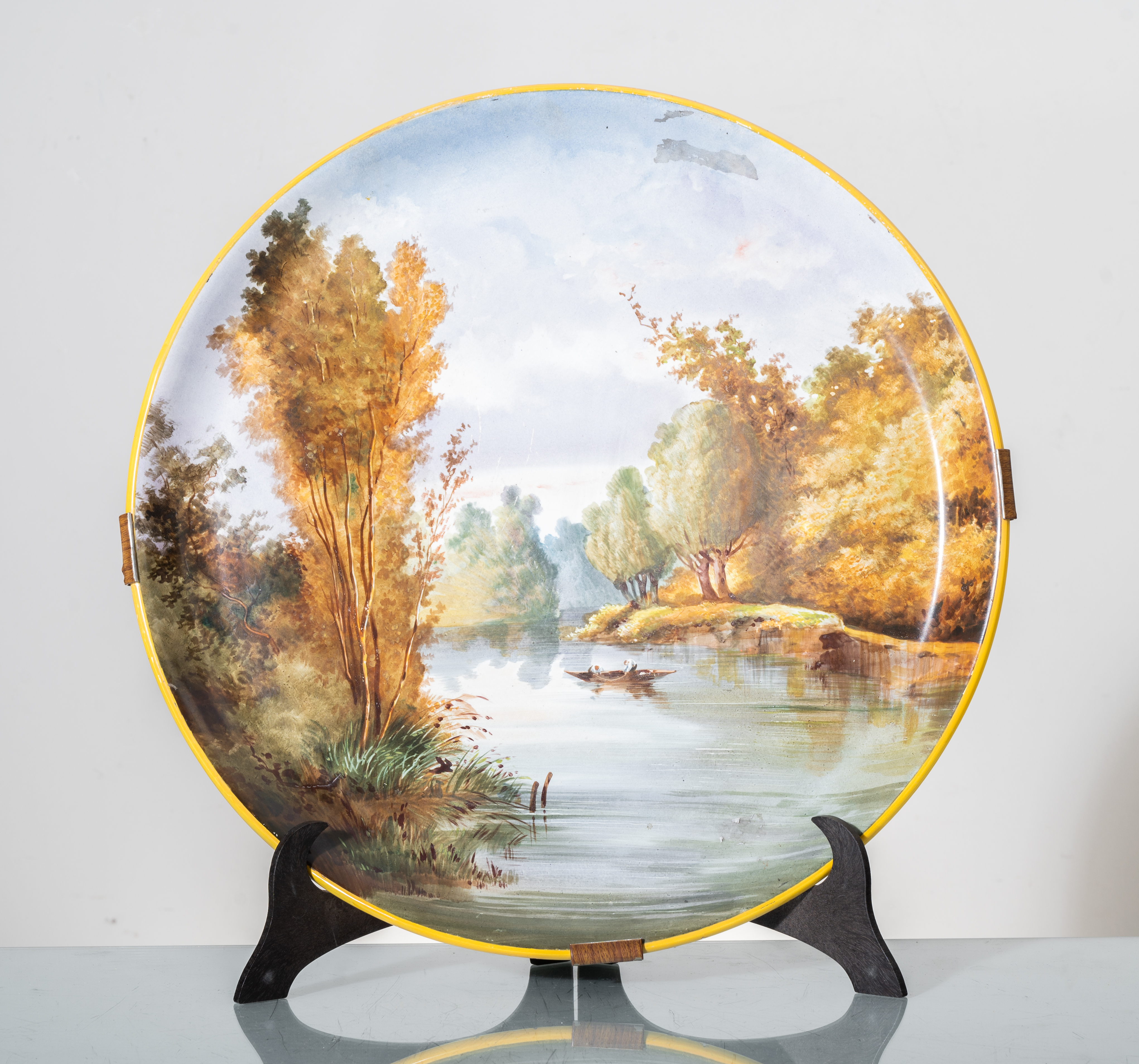 Grande piatto in ceramica dipinta raffigurante "Paesaggio fluviale".