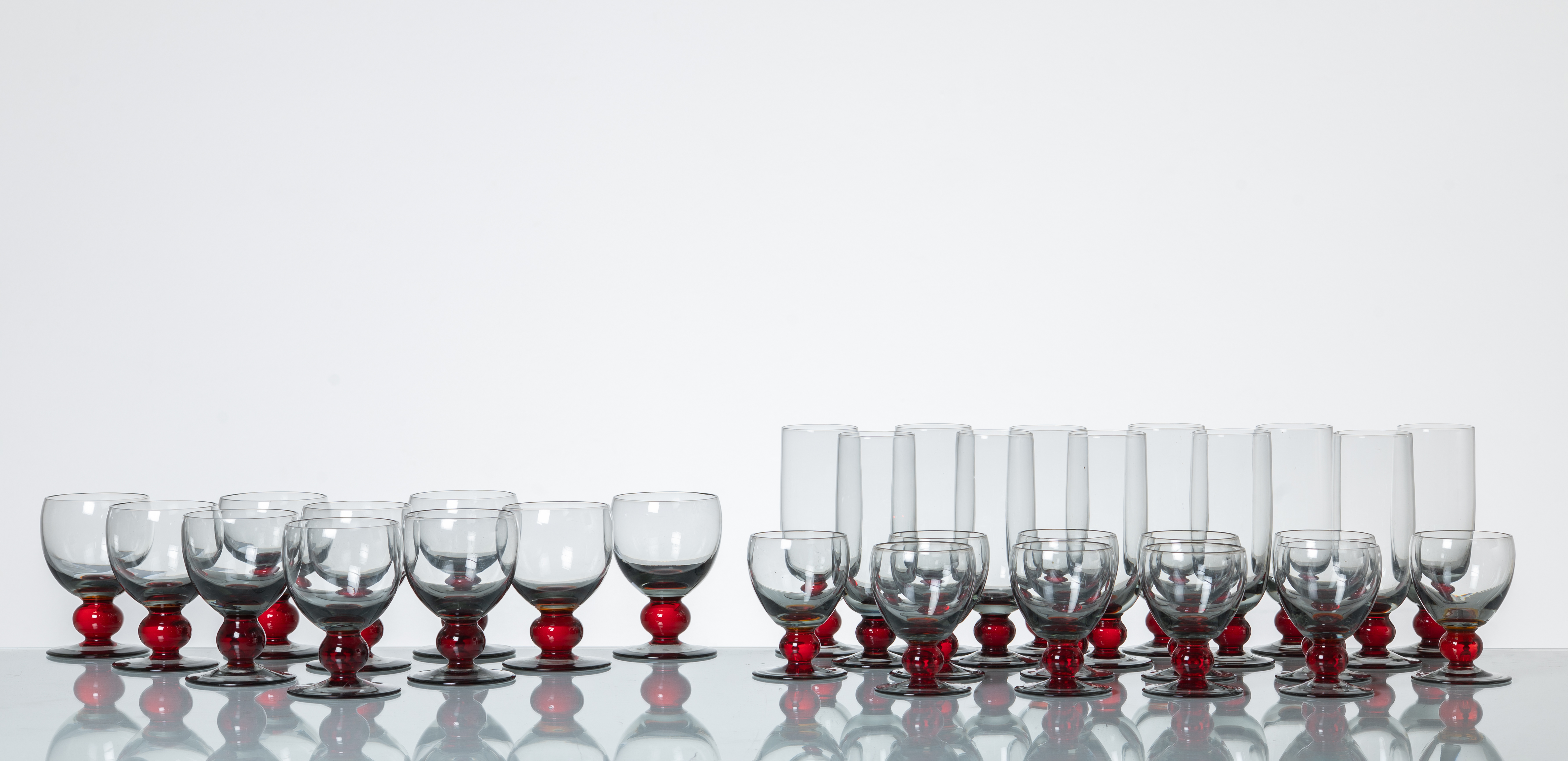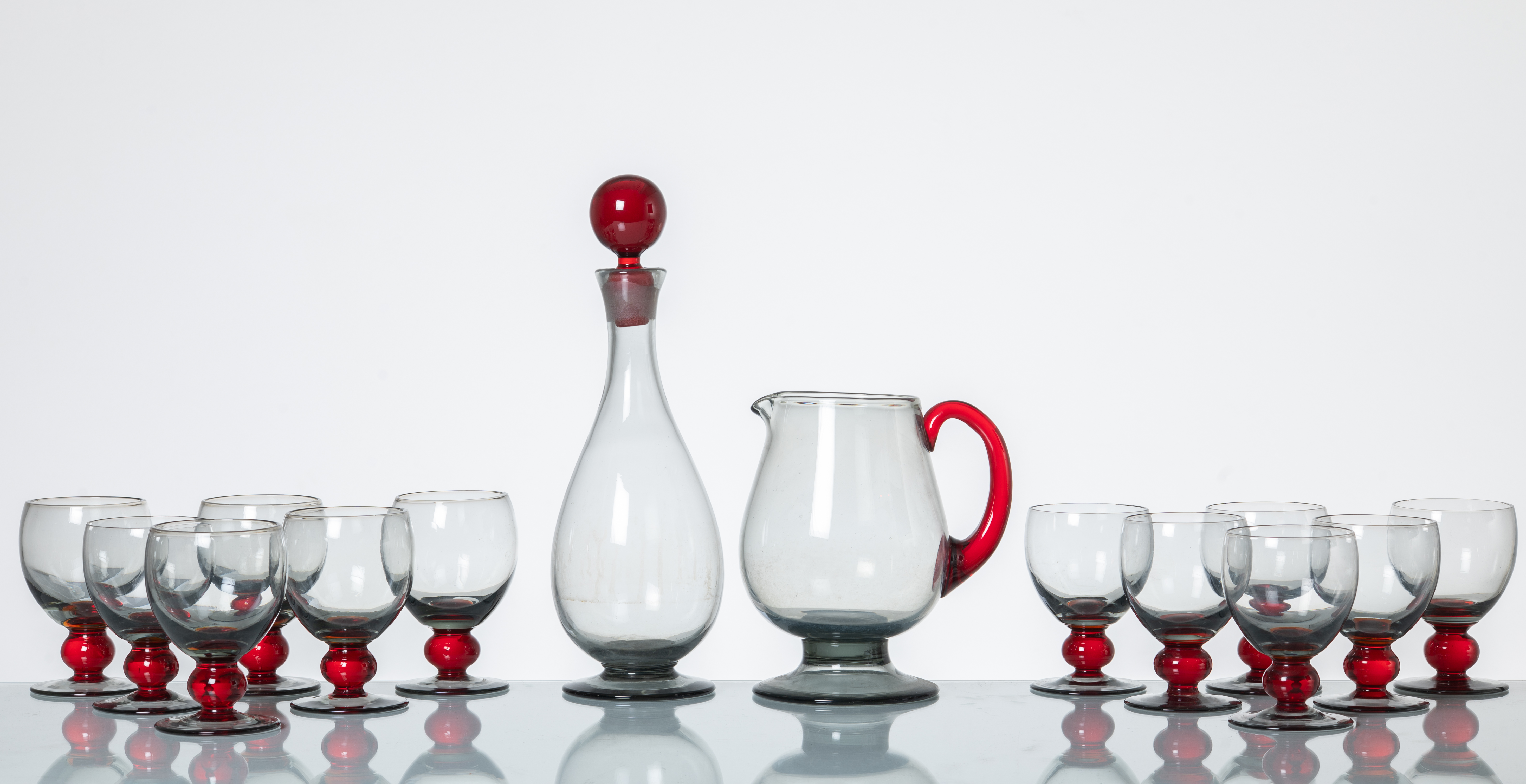 Servizio di bicchieri a calice in vetro fumè e rosso, composto da una caraffa, una bottiglia con tappo, dodici bicchieri acqua, dieci bicchieri vino, undici flutes, dieci bicchieri liquore.
