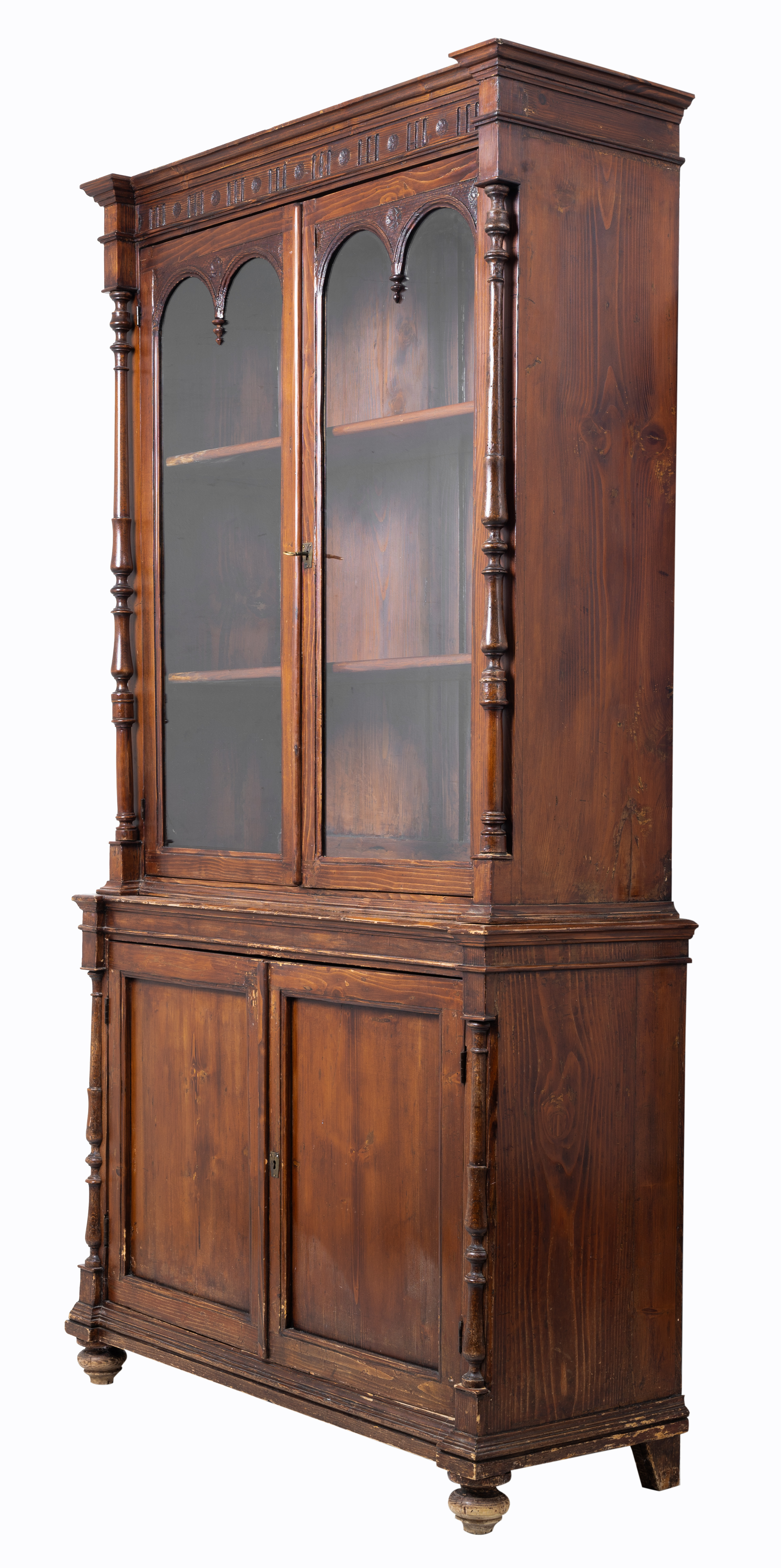 Grande credenza con vetrina doppio corpo a due ante nella parte sottostante, due ante a vetri nella parte sovrastante in legno di abete.
