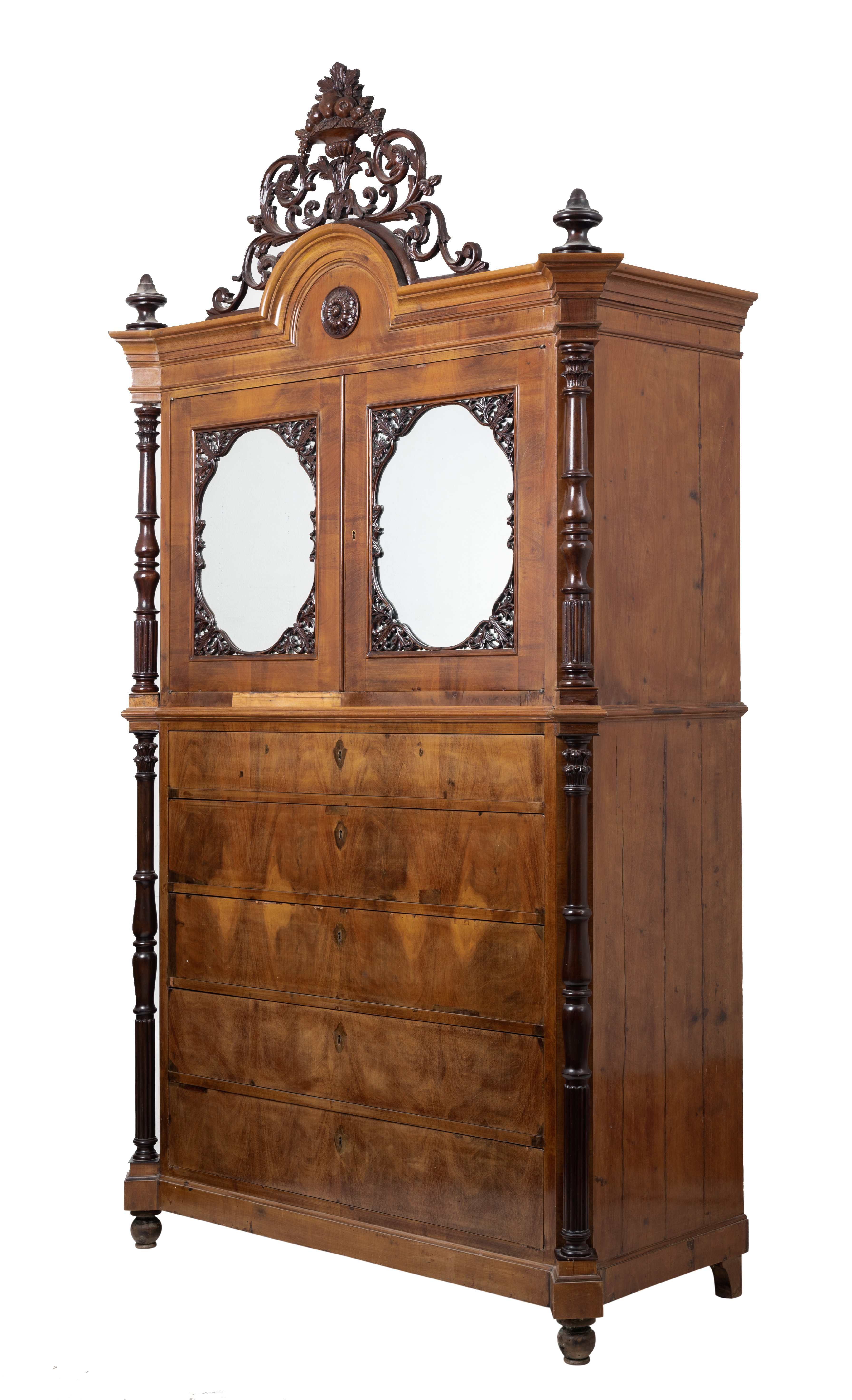 Chiffonier Luigi Filippo a cinque cassetti, due ante con specchi e colonne laterali in legno di mogano e piuma di mogano.