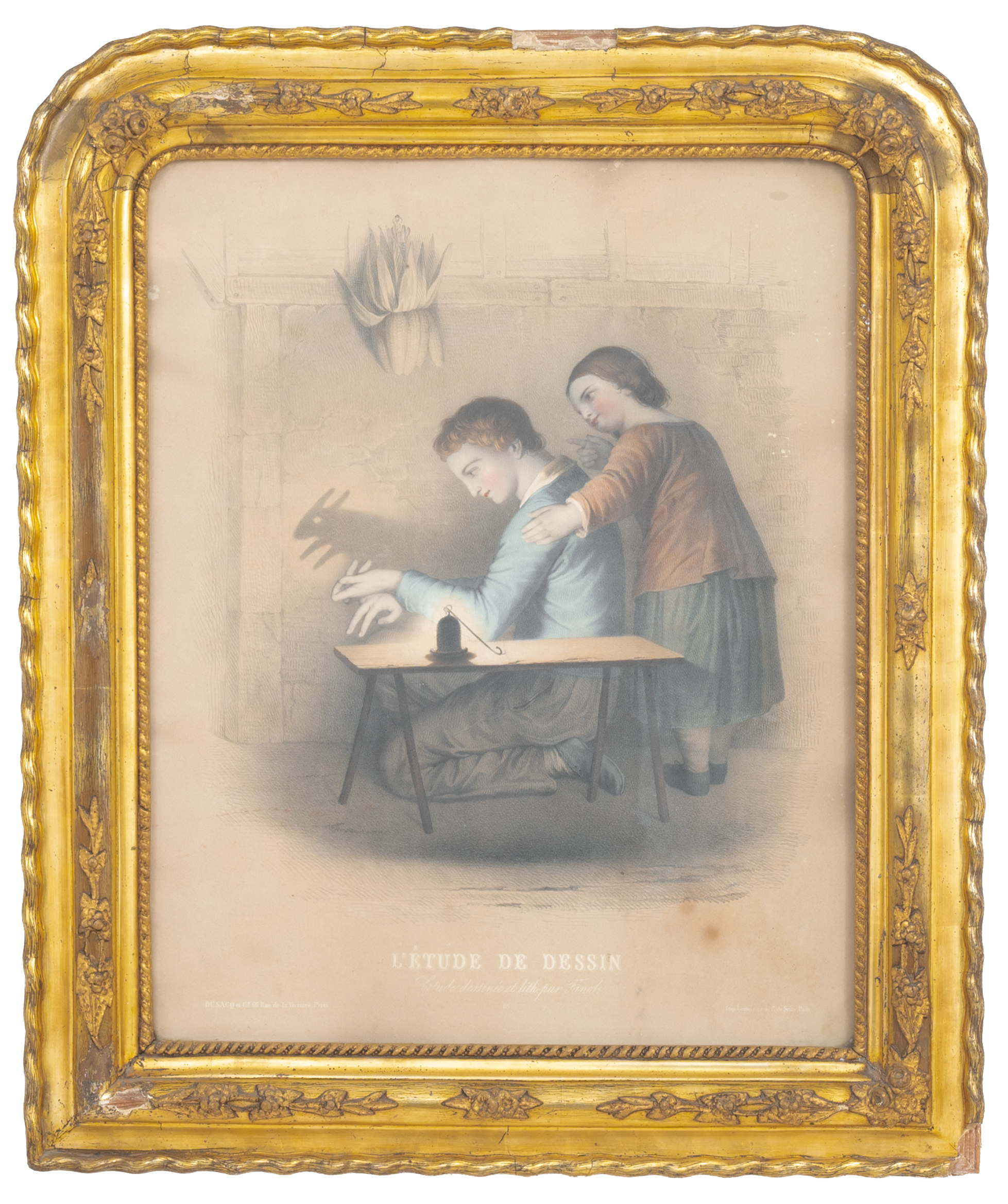 Cornice in legno e pastiglia dorata ad argento a mecca, all'interno incisione a colori "L'étude de dessin" (mancanze ed usure).