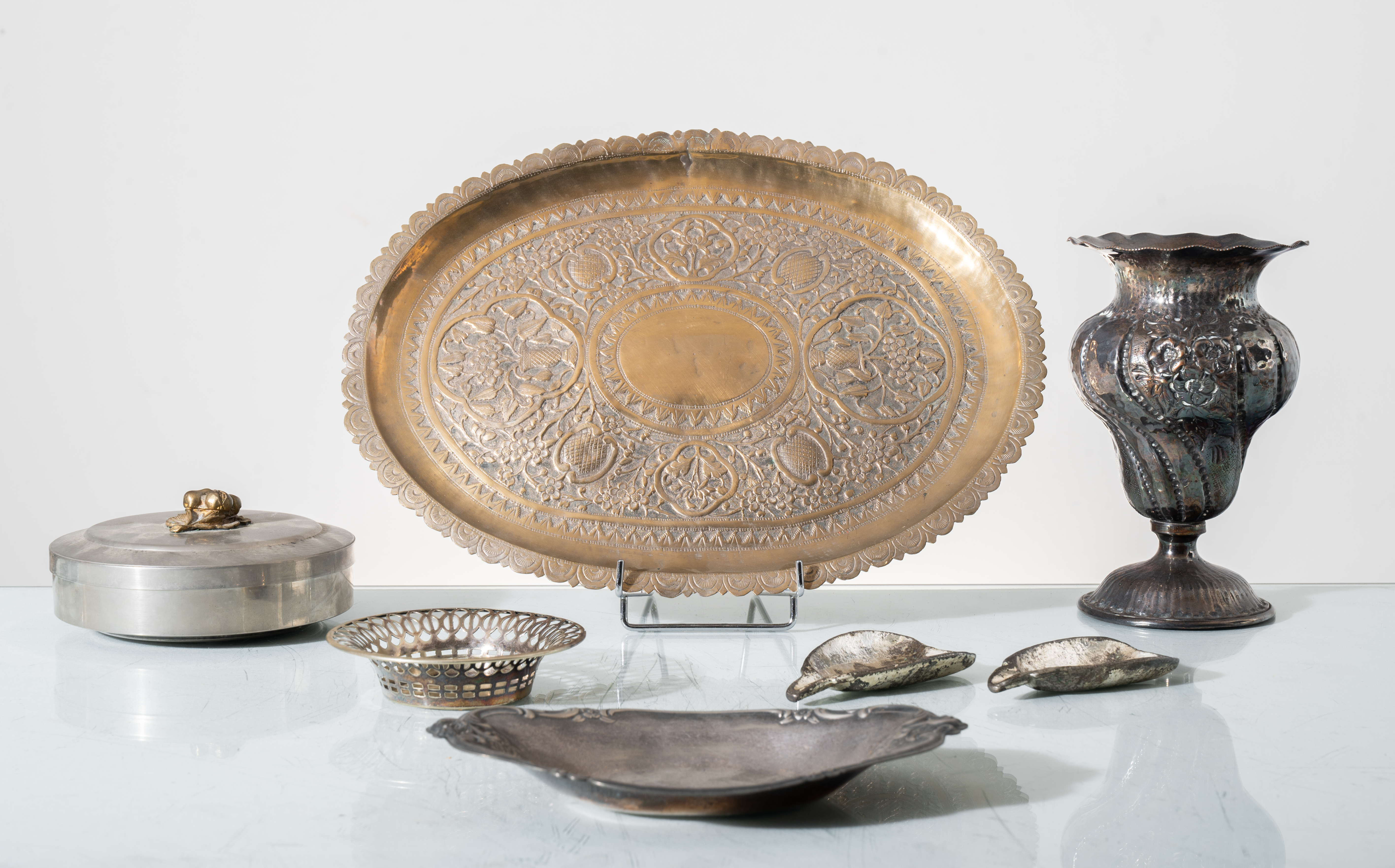 Vassoio, scatola portagioie, vaso, svuotatasche, piccolo cestino e due foglie in metallo argentato.