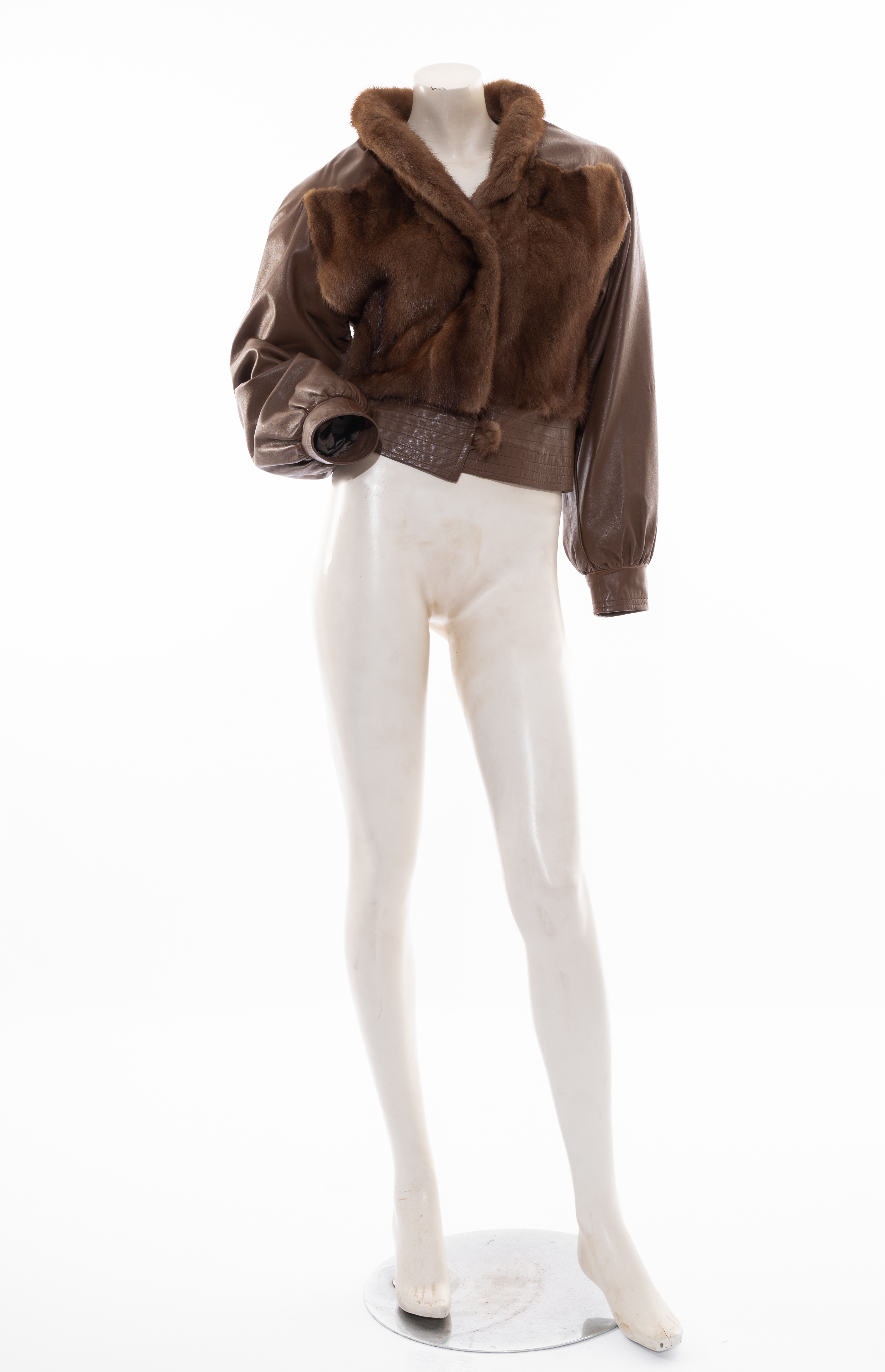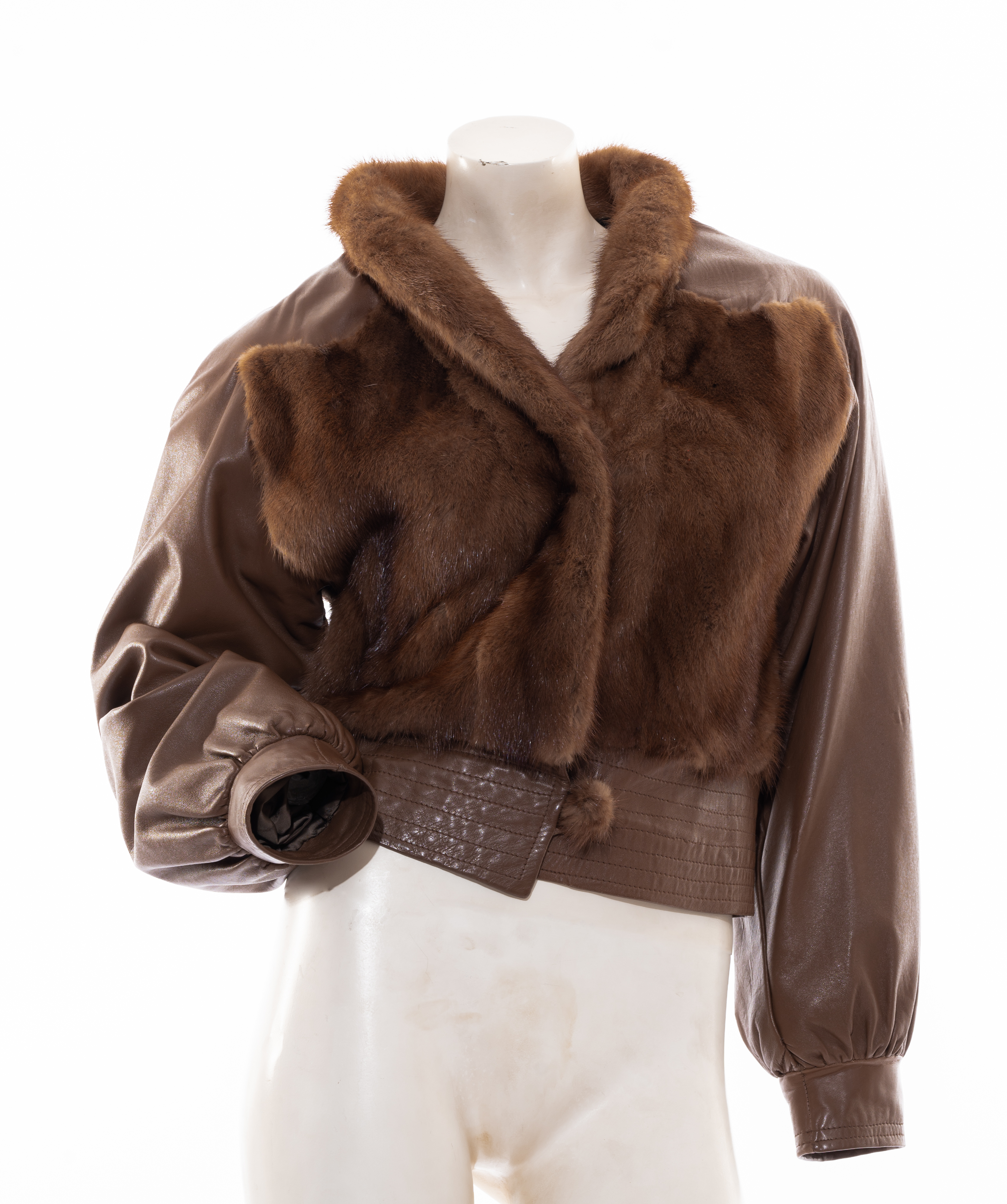 Giacca in pelle marrone con fronte in pelliccia di visone miele, collo ampio, chiusura frontale, ampie maniche. Taglia S.