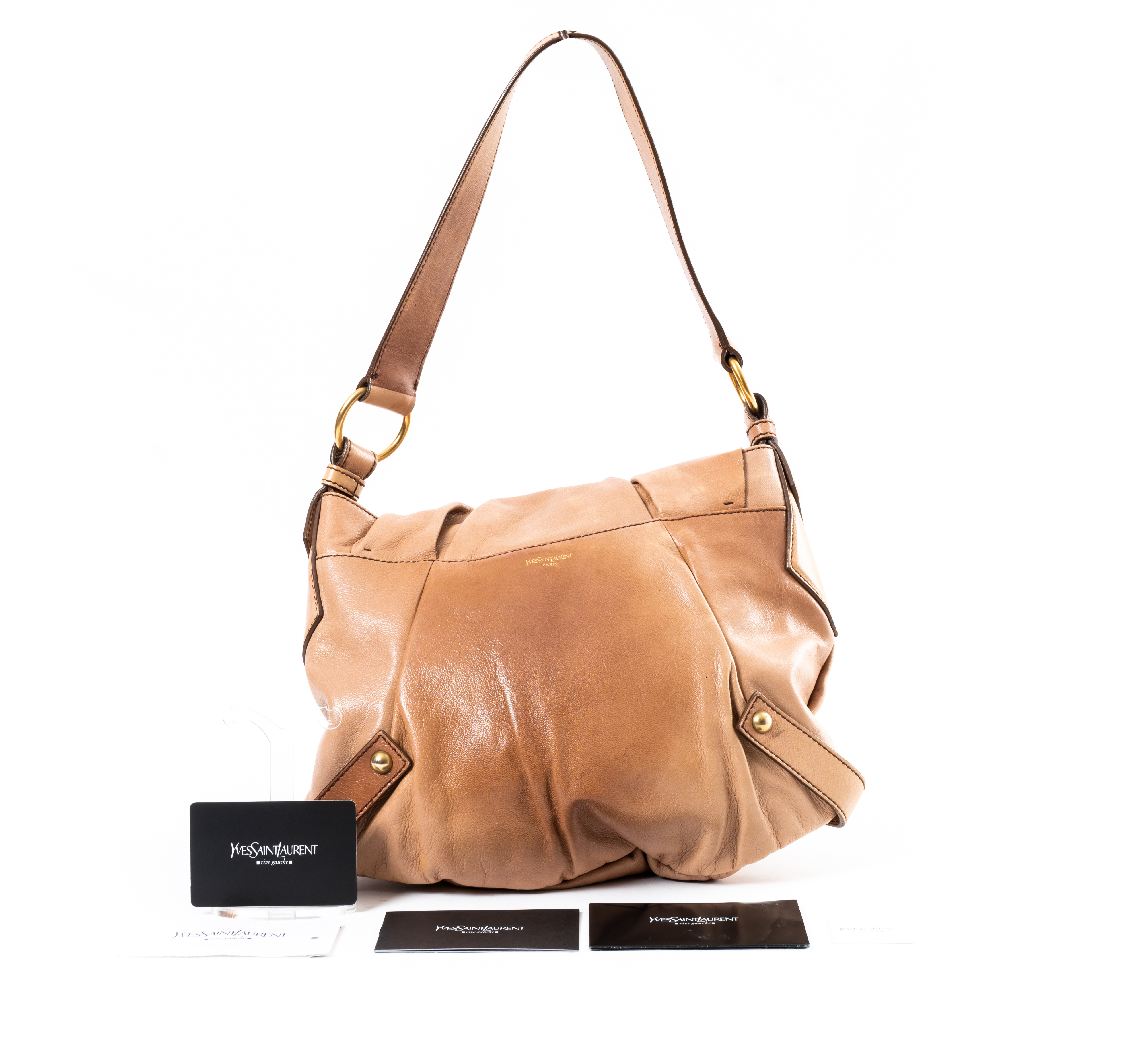 Borsa a tracolla con fiocco in pelle di vitello beige, chiusura sulla patta, manico piatto, tasche interne, minuterie in metallo dorato. Card. Marchio di produzione.