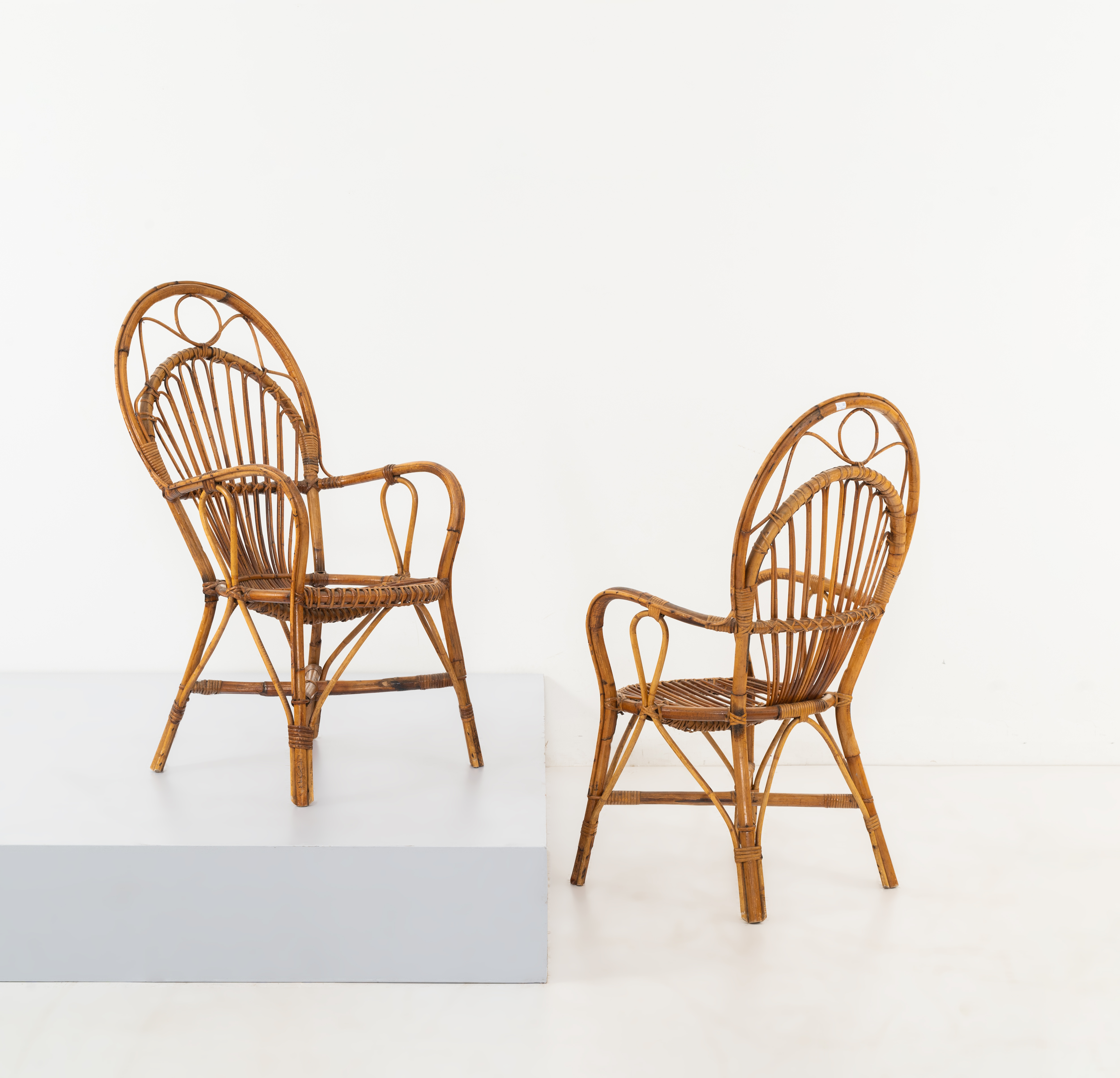 Coppia di poltrone in canna di bamboo e rattan, spalliera curvata e decorata con elementi geometrici.
