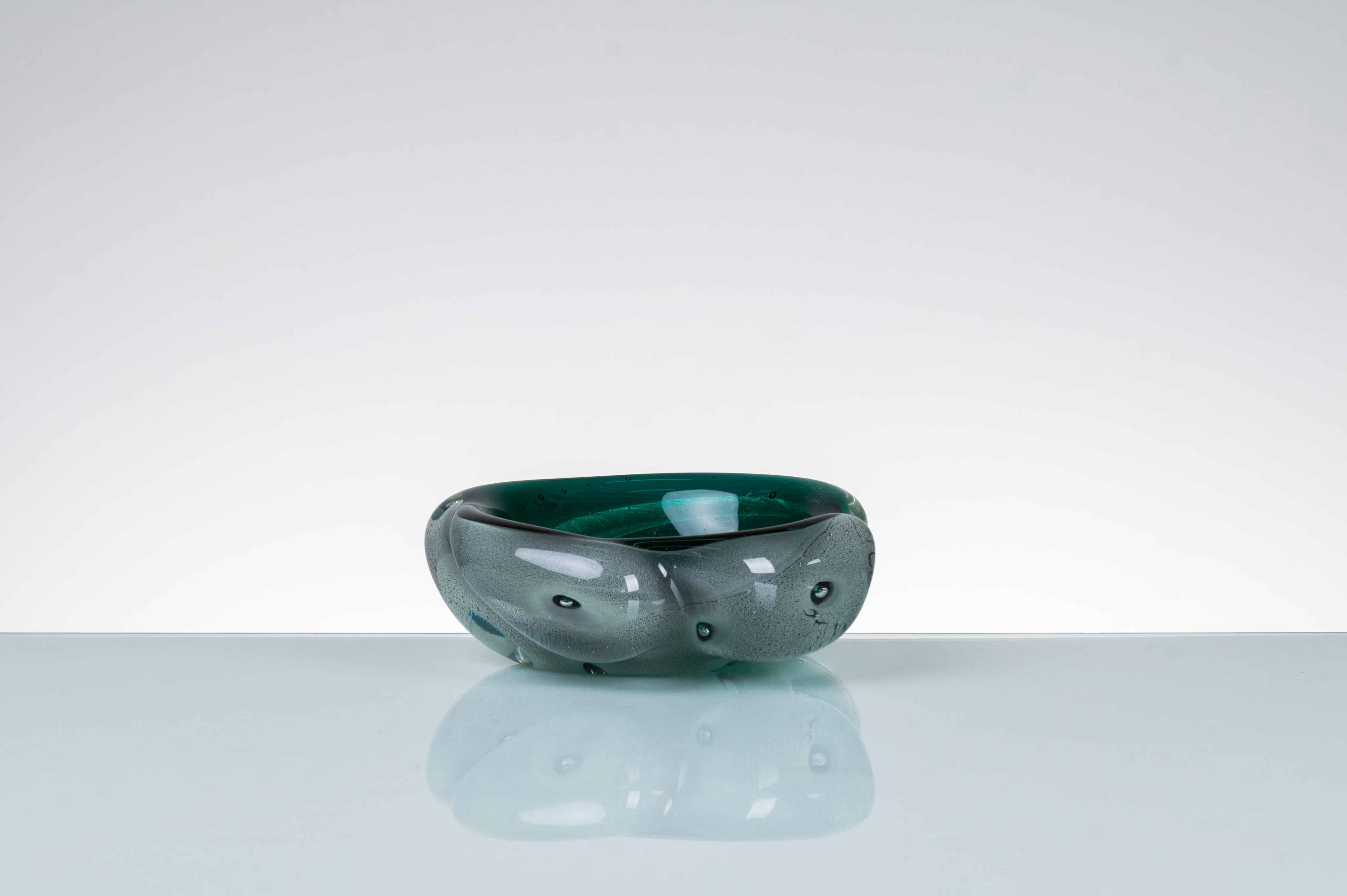 Posacenere in vetro sommerso bullicante verde, corpo a ciotola di forma irregolare.