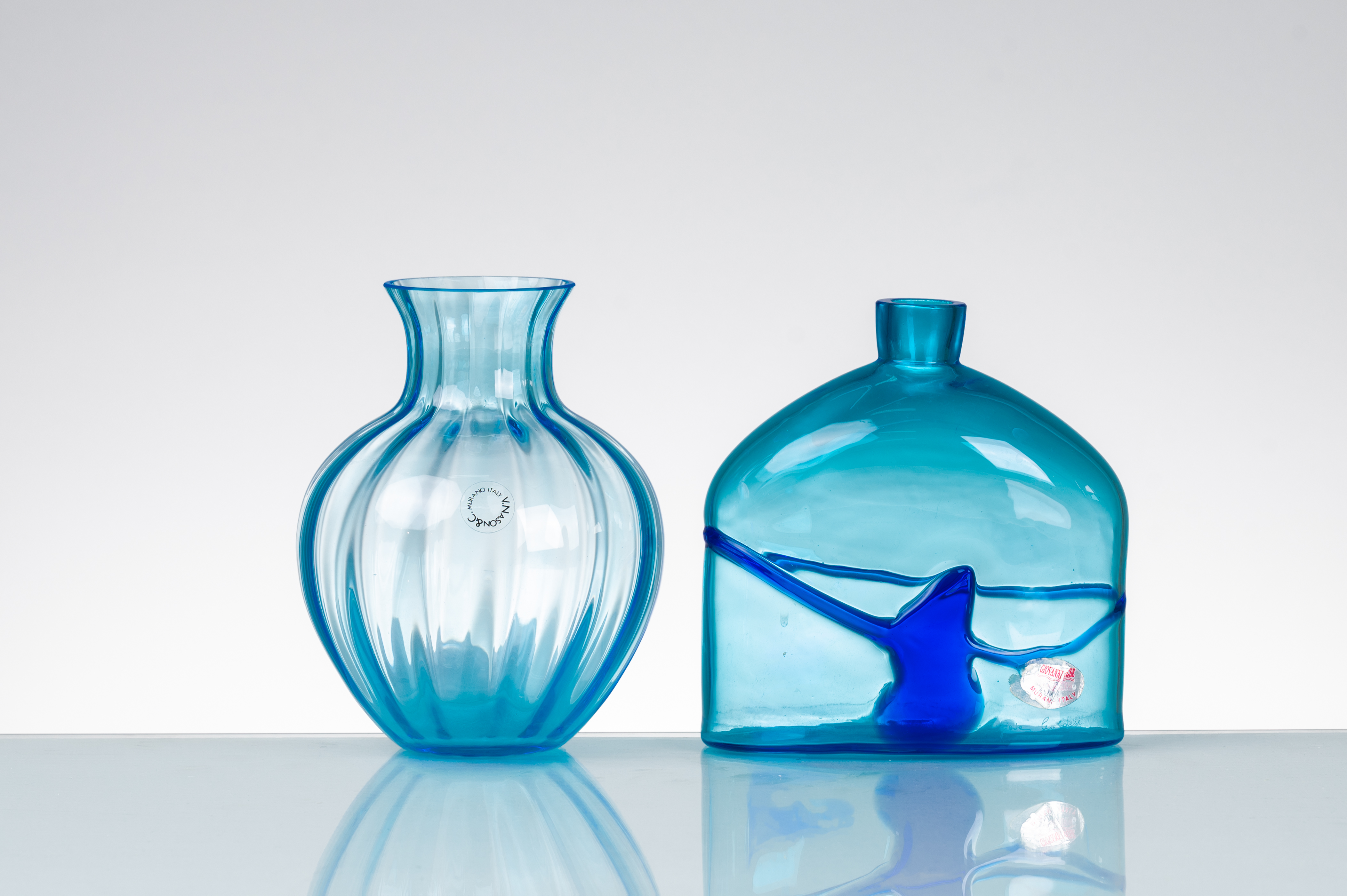 Vaso in vetro azzurrino e decorato con decoro astratto blu, corpo semisferico con basso collo e bocca circolare piana. Etichetta di produzione. Vaso in vetro azzurrino con lavorazione a costole verticali, corpo sferico con collo a vaso e bocca circolare piana. Etichetta di produzione.