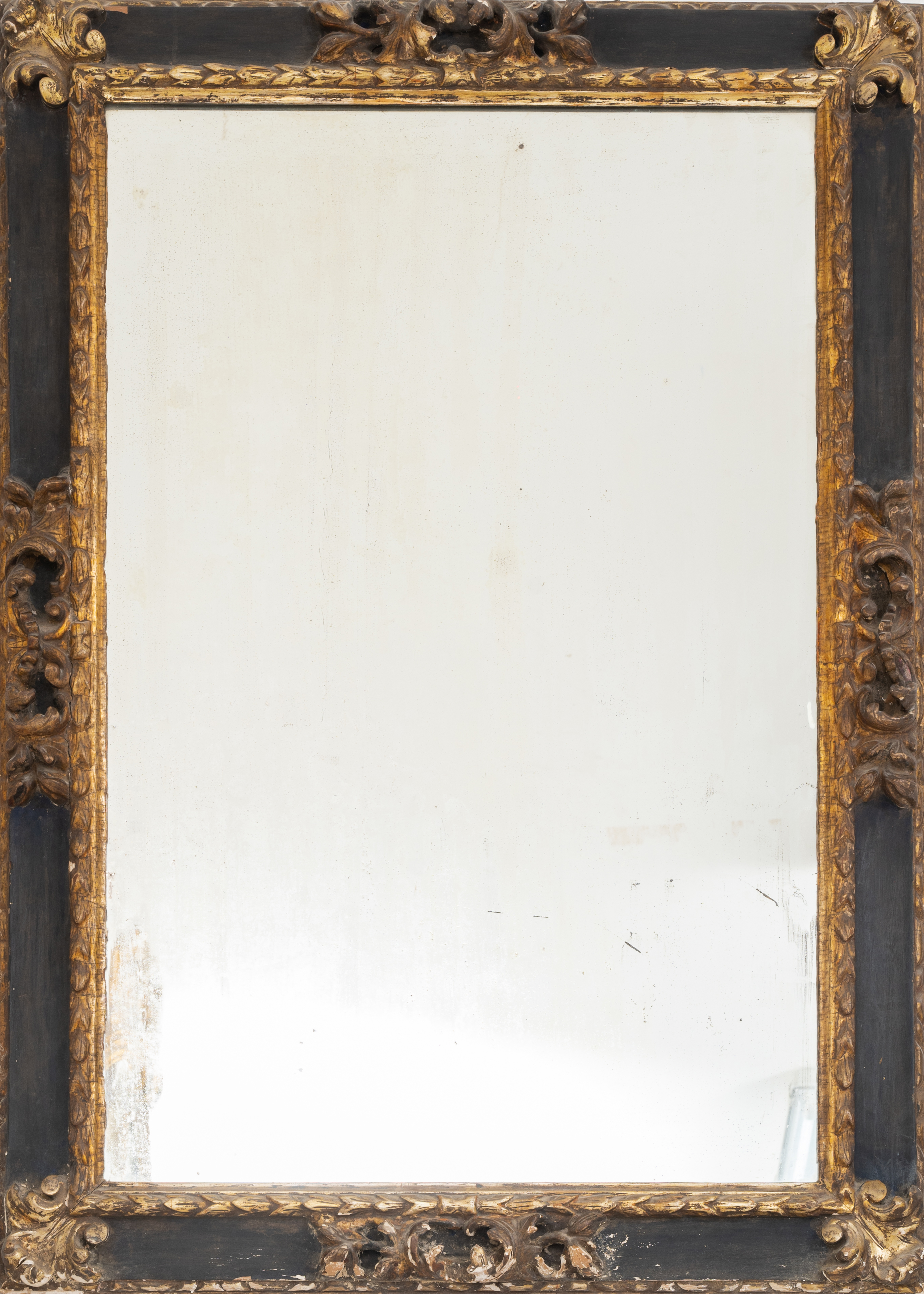 Specchiera in legno laccato e dorato ad argento a mecca (specchio non coevo).