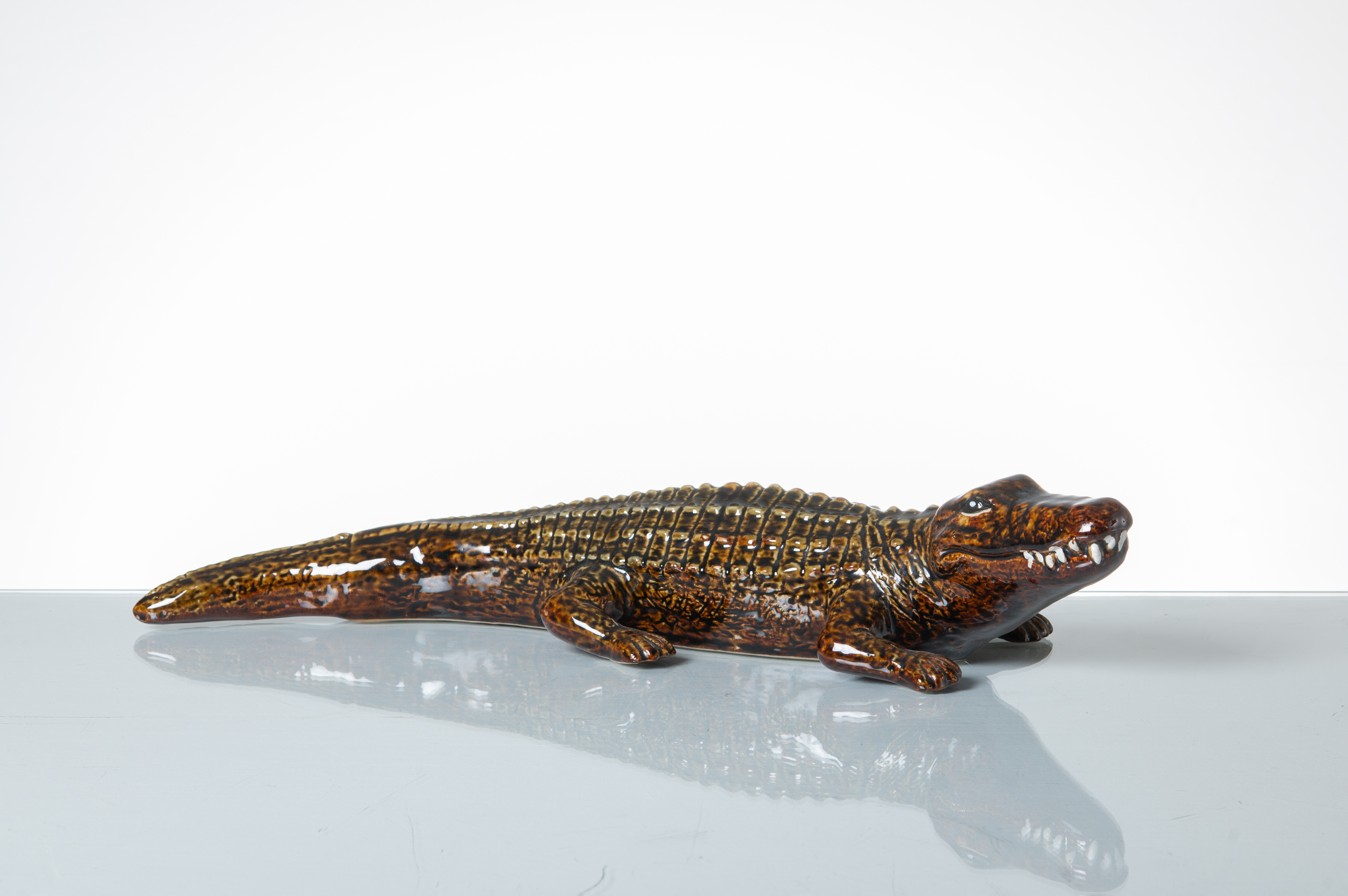 Scultura di coccodrillo in ceramica invetriata e decorata in marrone e verde scuro.