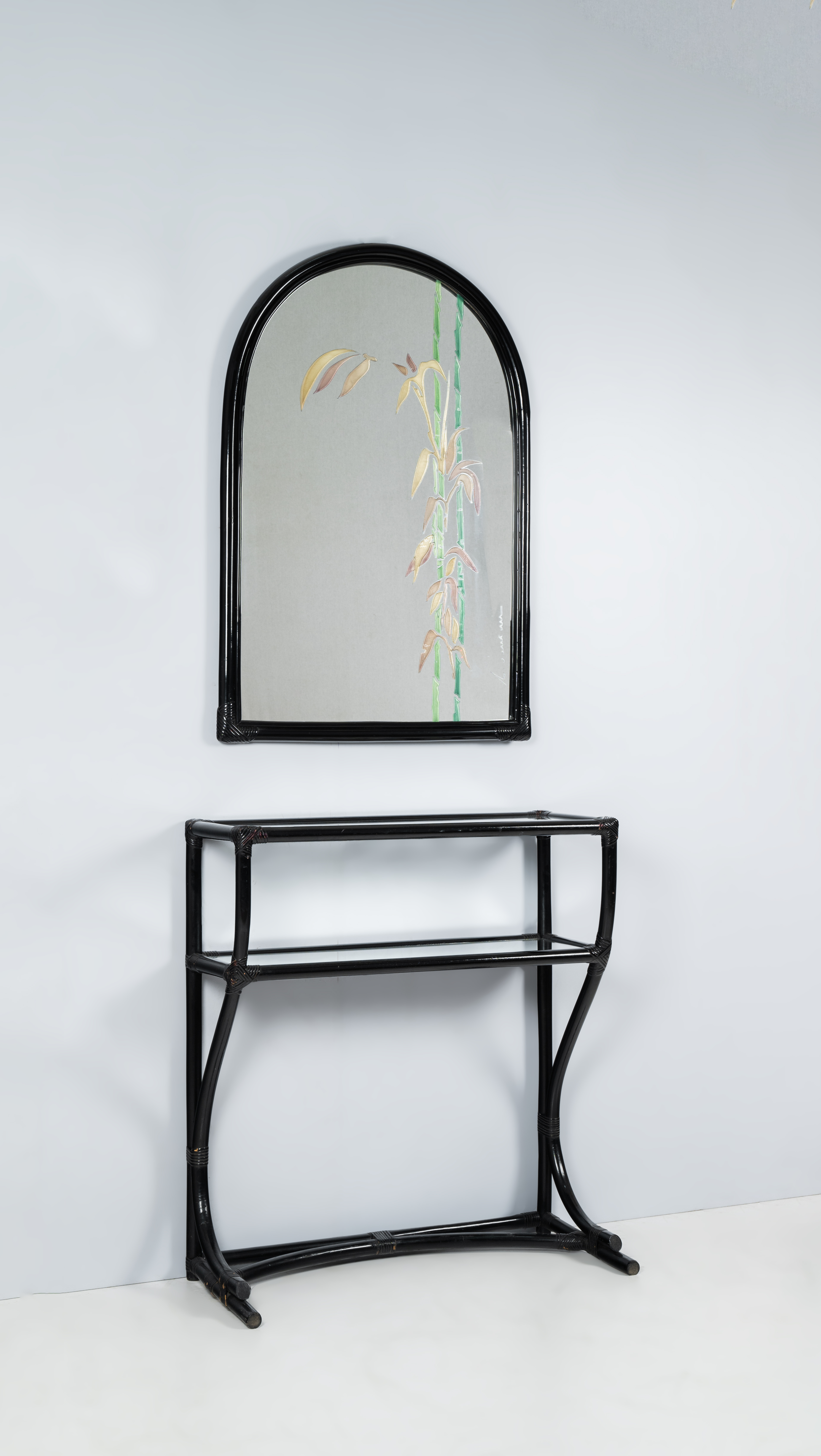 Consolle con specchio da parete in bamboo laccato nero. Consolle con fianchi sagomati, due piani in vetro incolore, quello superiore con decoro policromo di tralcio di bamboo. Specchio da parete con cimasa arcata, cristallo specchiato con decoro policromo di tralcio di bamboo.
