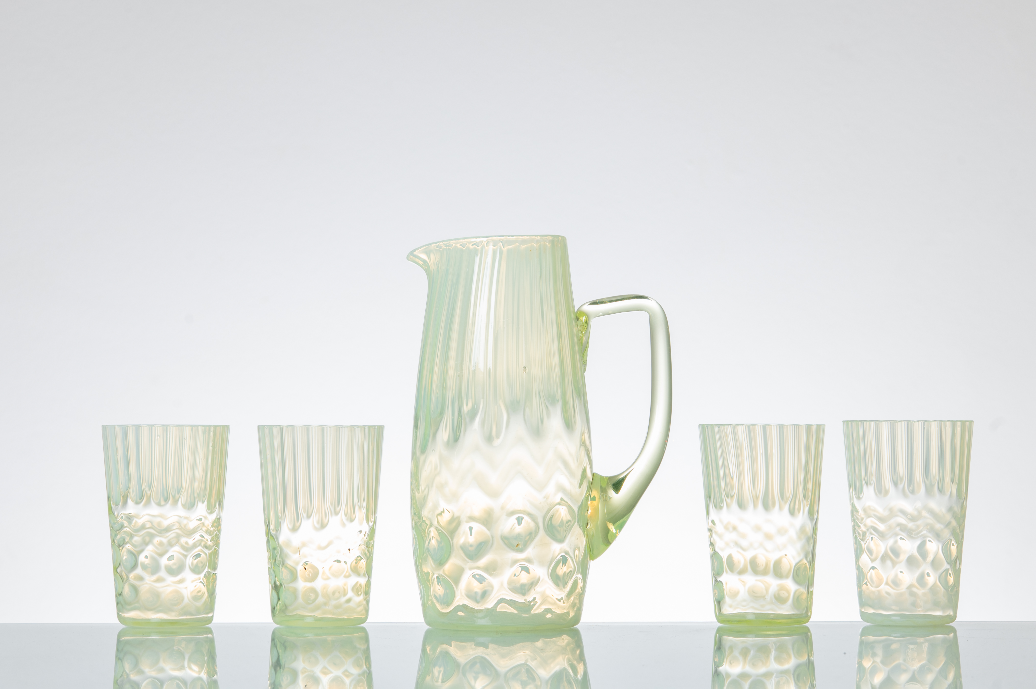 Quattro bicchieri ed una caraffa in vetro soffiato verdino e decorato con motivi geometrici in vetro opalescente.