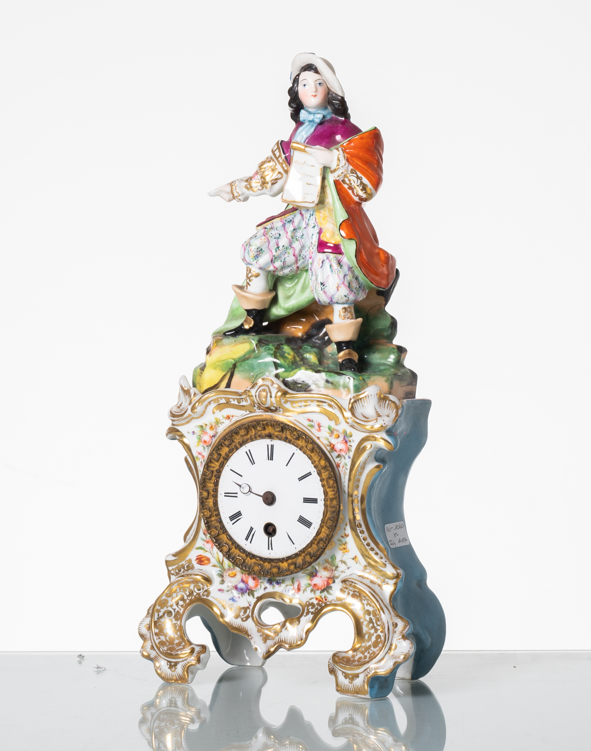 Orologio in porcellana Vecchia Parigi, decorata e lumeggiata in oro, con scultura nella parte superiore raffigurante "Cavaliere" (usure e mancanze).