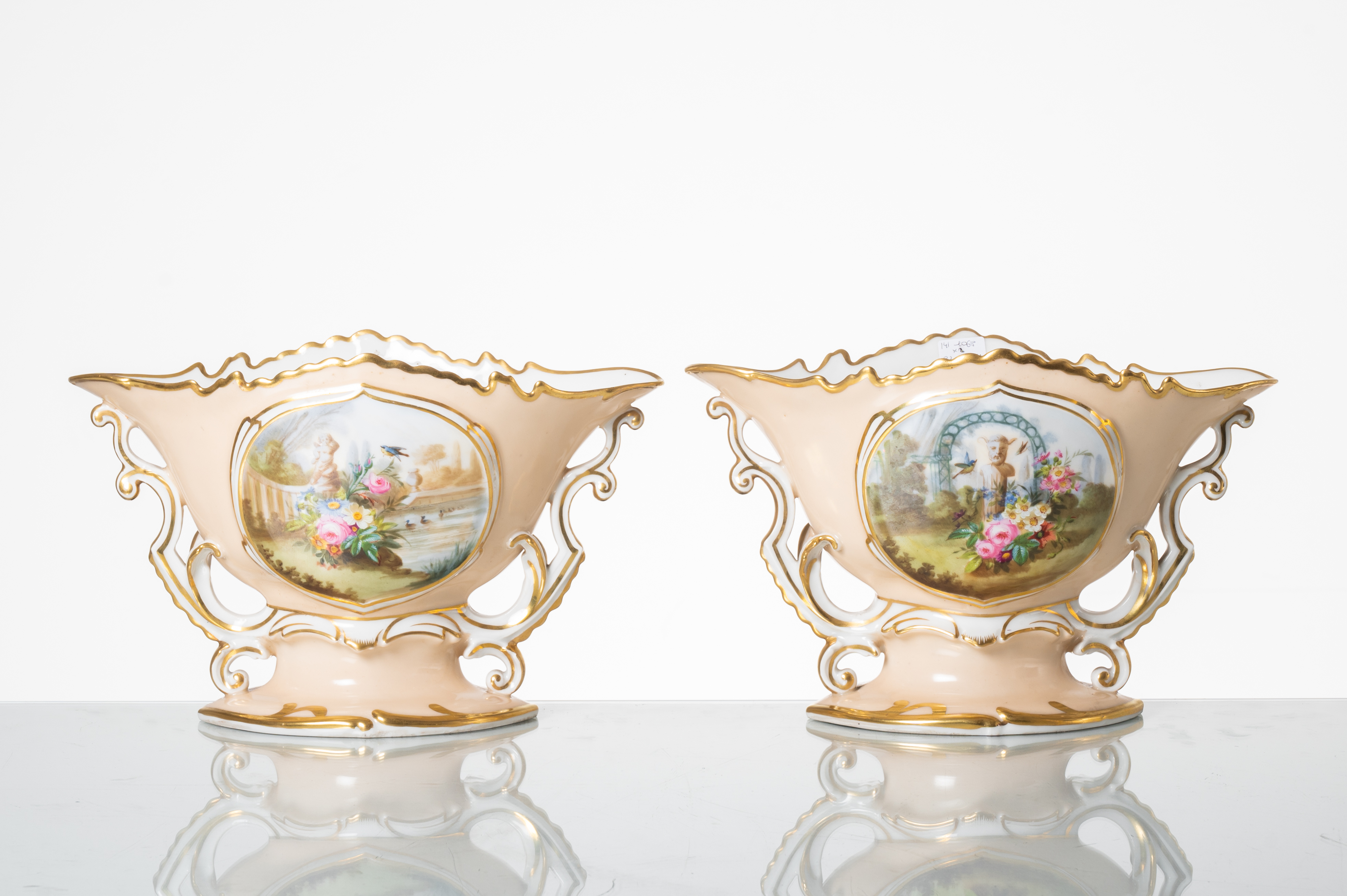 Coppia di fioriere Luigi Filippo in porcellana decorata.