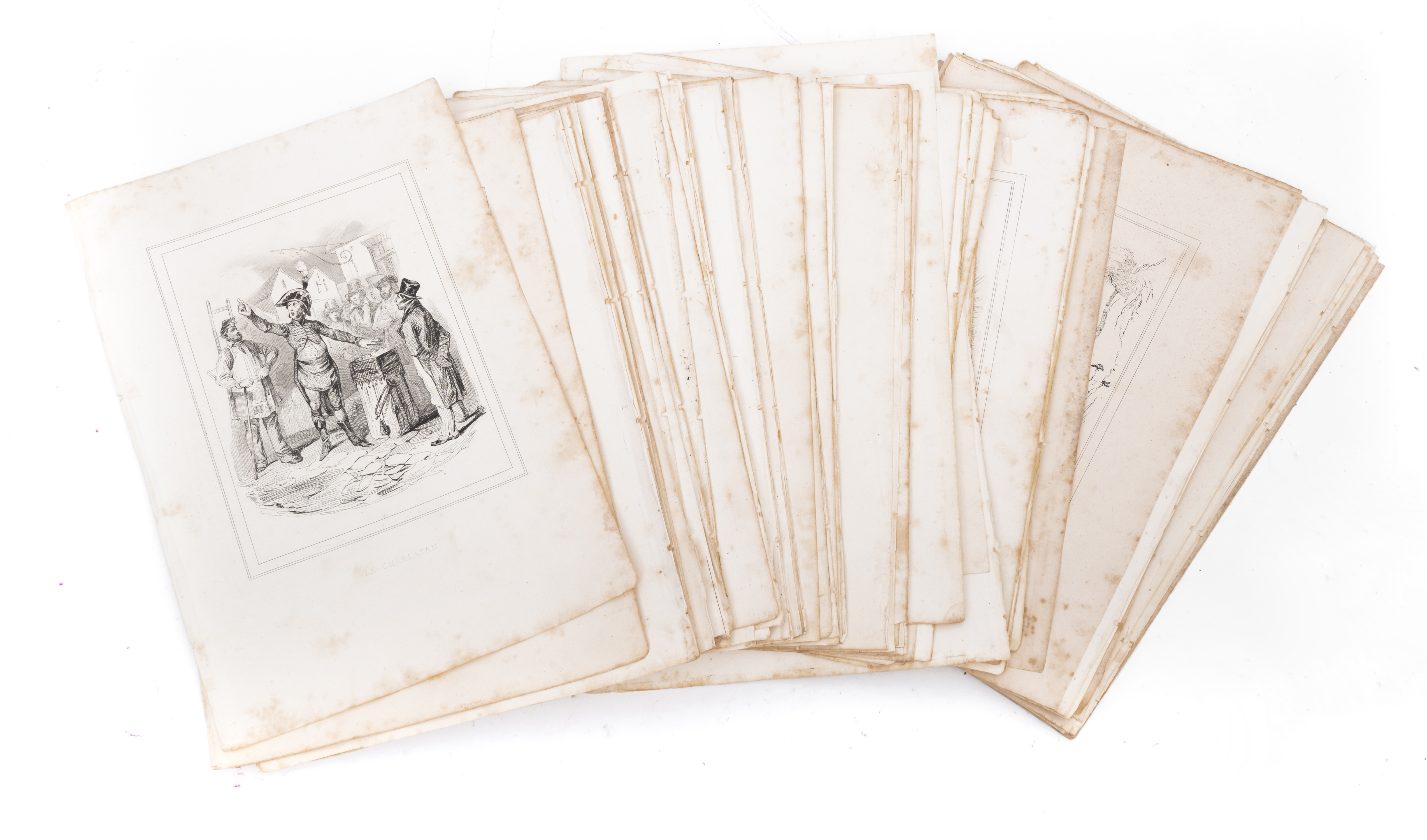 CENTONOVE STAMPE pubblicate a Parigi da Delloye, Desmè e Cie nel 1838 per l’opera Fables de Florian, Illustrées par Victor Adam. Précédée d'une notice par Charles Nodier et d'un Essai sur la Fable. Le stampe di cm 25x 16 realizzate in calcografia sono tutte in ottime condizioni.