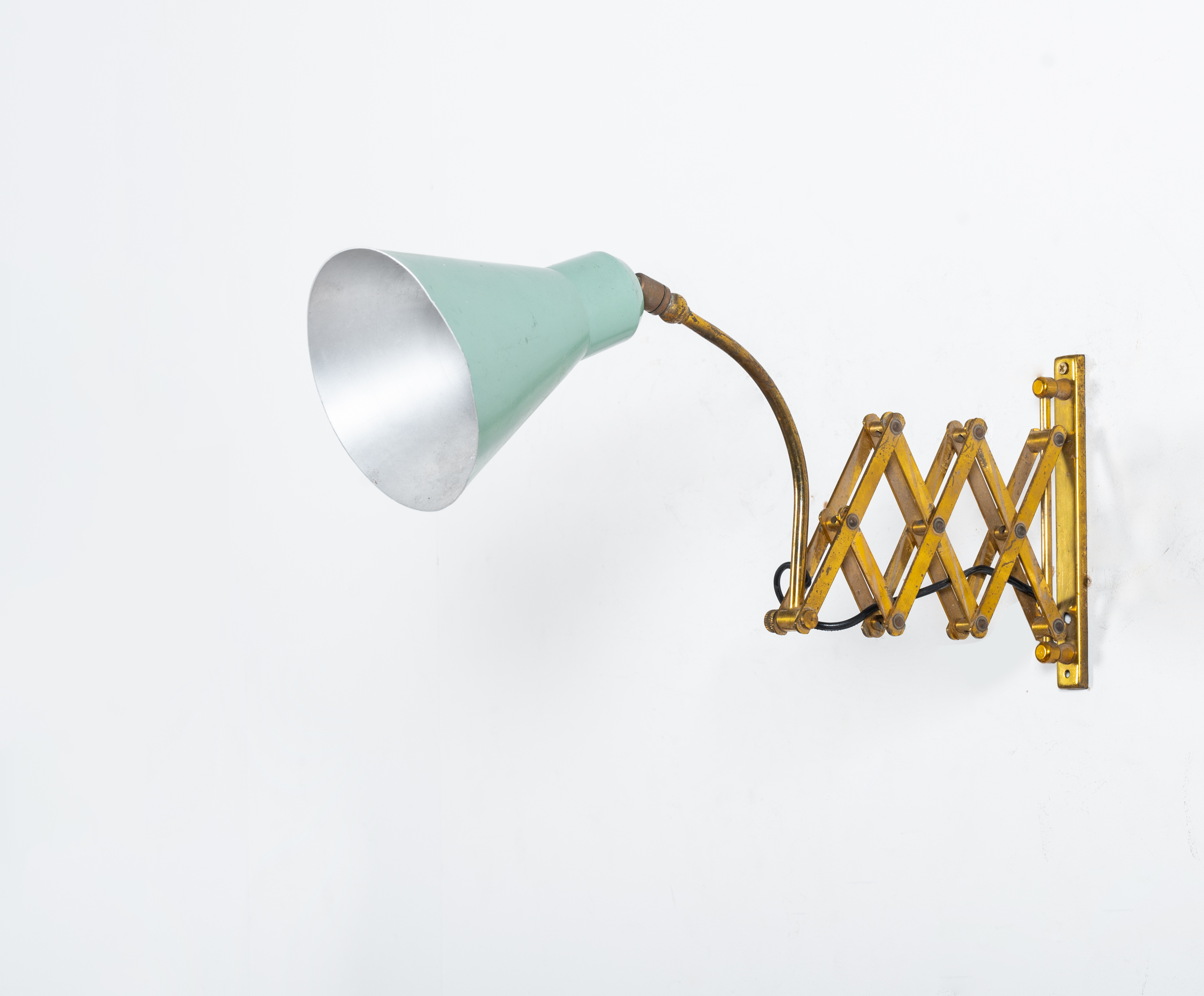 Lampada da parete estendibile ad una luce, struttura in metallo dorato, diffusore conico orientabile in alluminio verniciato verde.