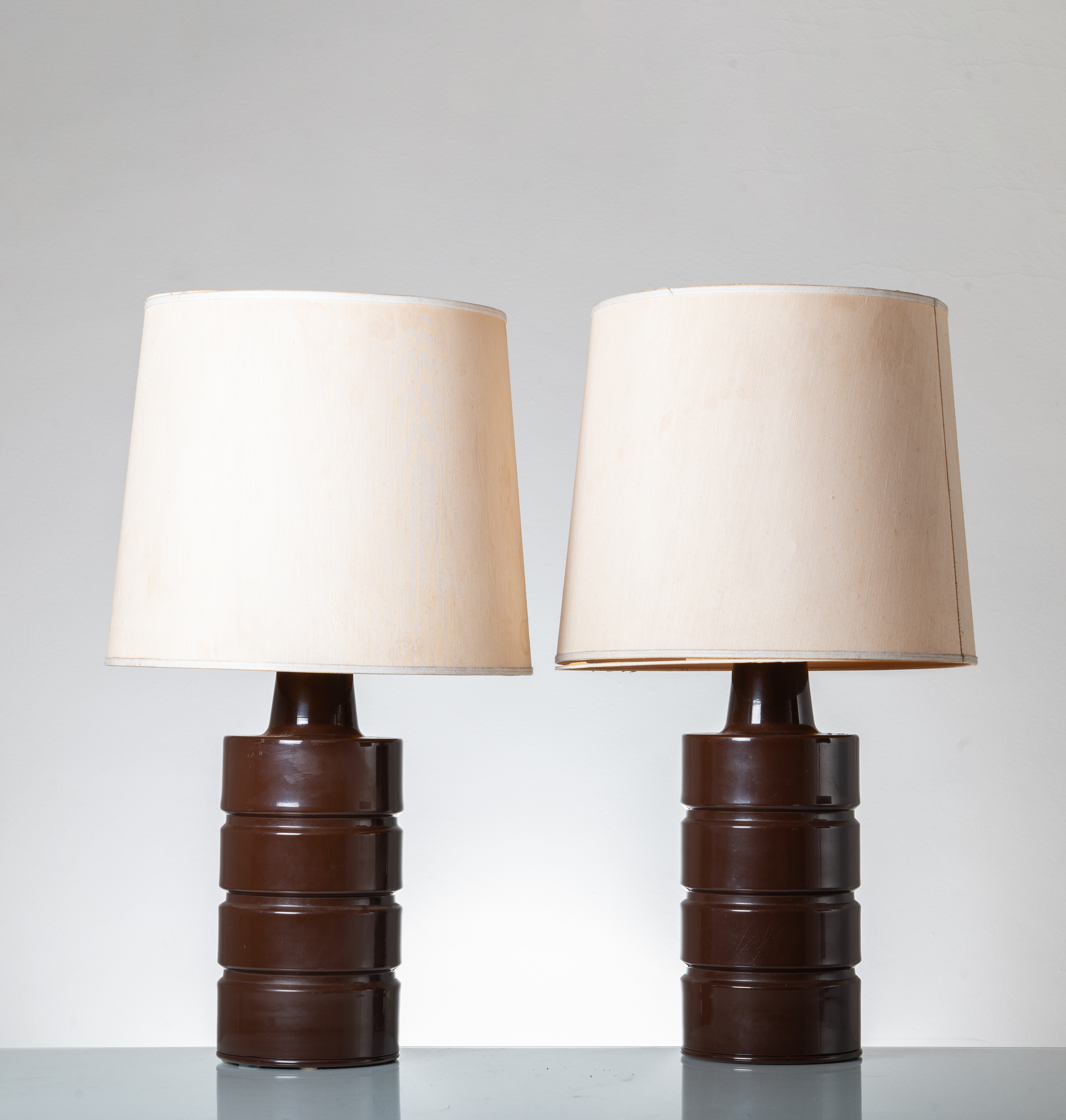 Coppia di lampade da tavolo ad una luce, struttura in metallo verniciato marrone, corpo cilindrico con scanalature orizzontali, diffusore in tessuto avorio. Macchie sul diffusore.
