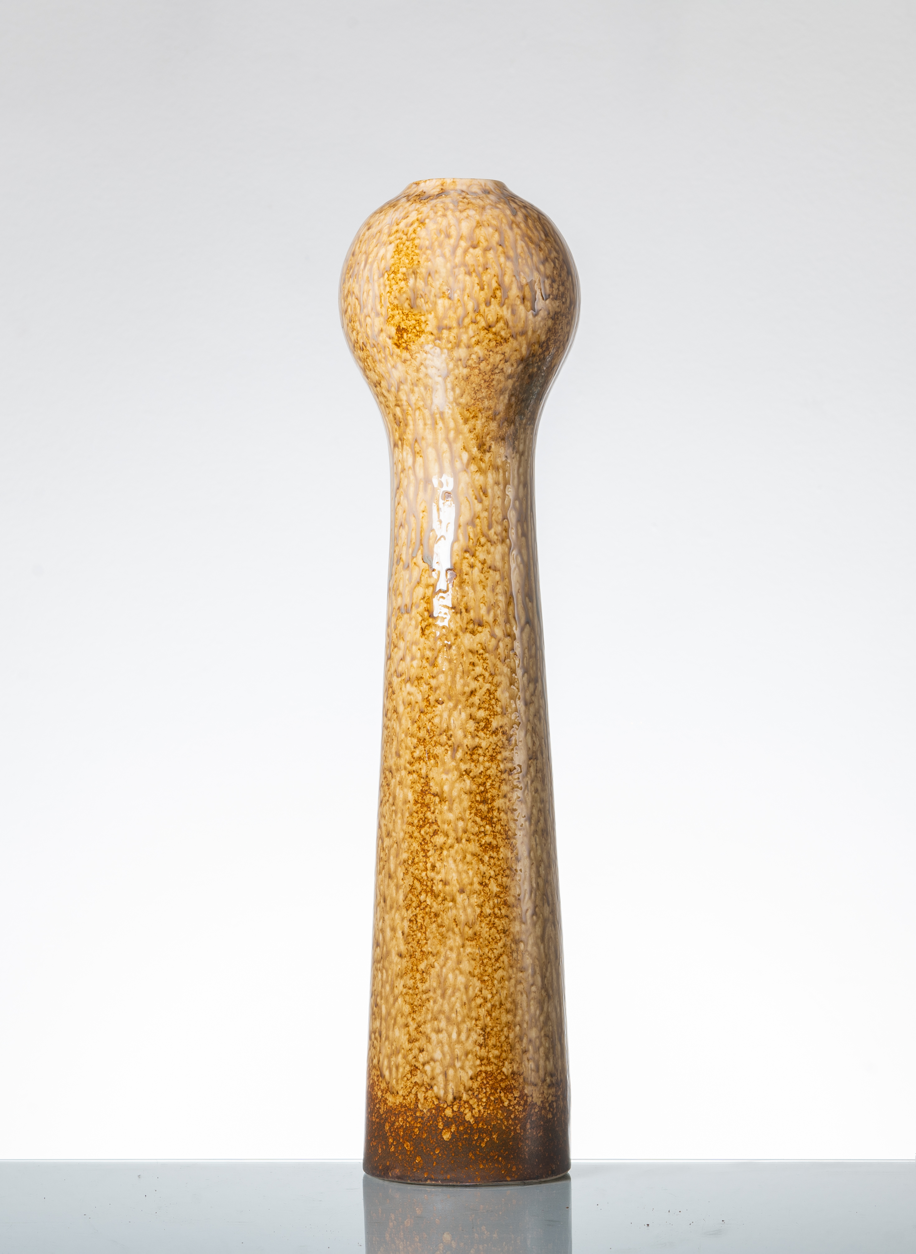 Vaso in ceramica smaltata ed invetriata decorata con percolature brune su fondo senape, corpo conico con apertura globulare sulla parte superiore, bocca piana circolare. Numero di serie incusso.