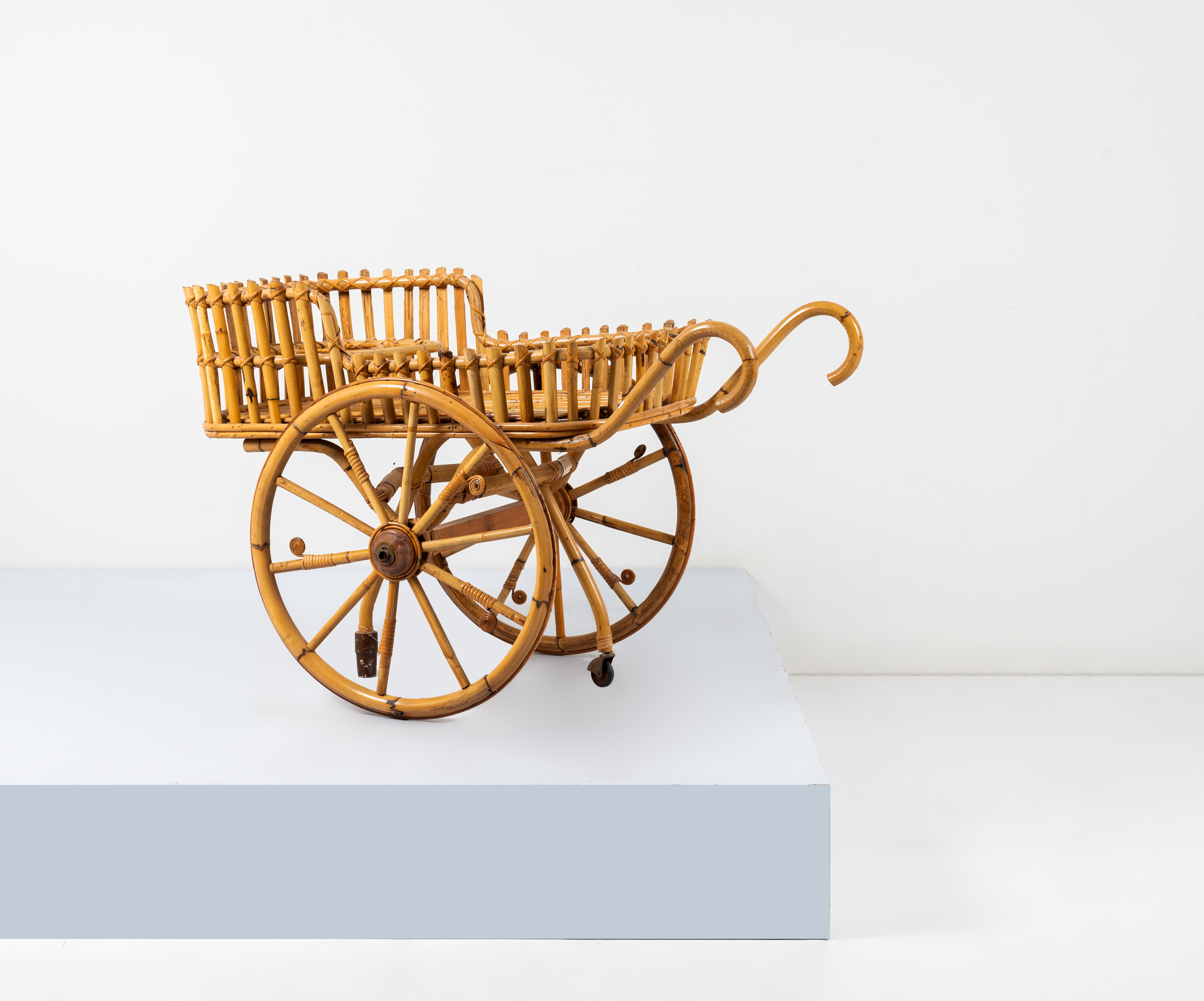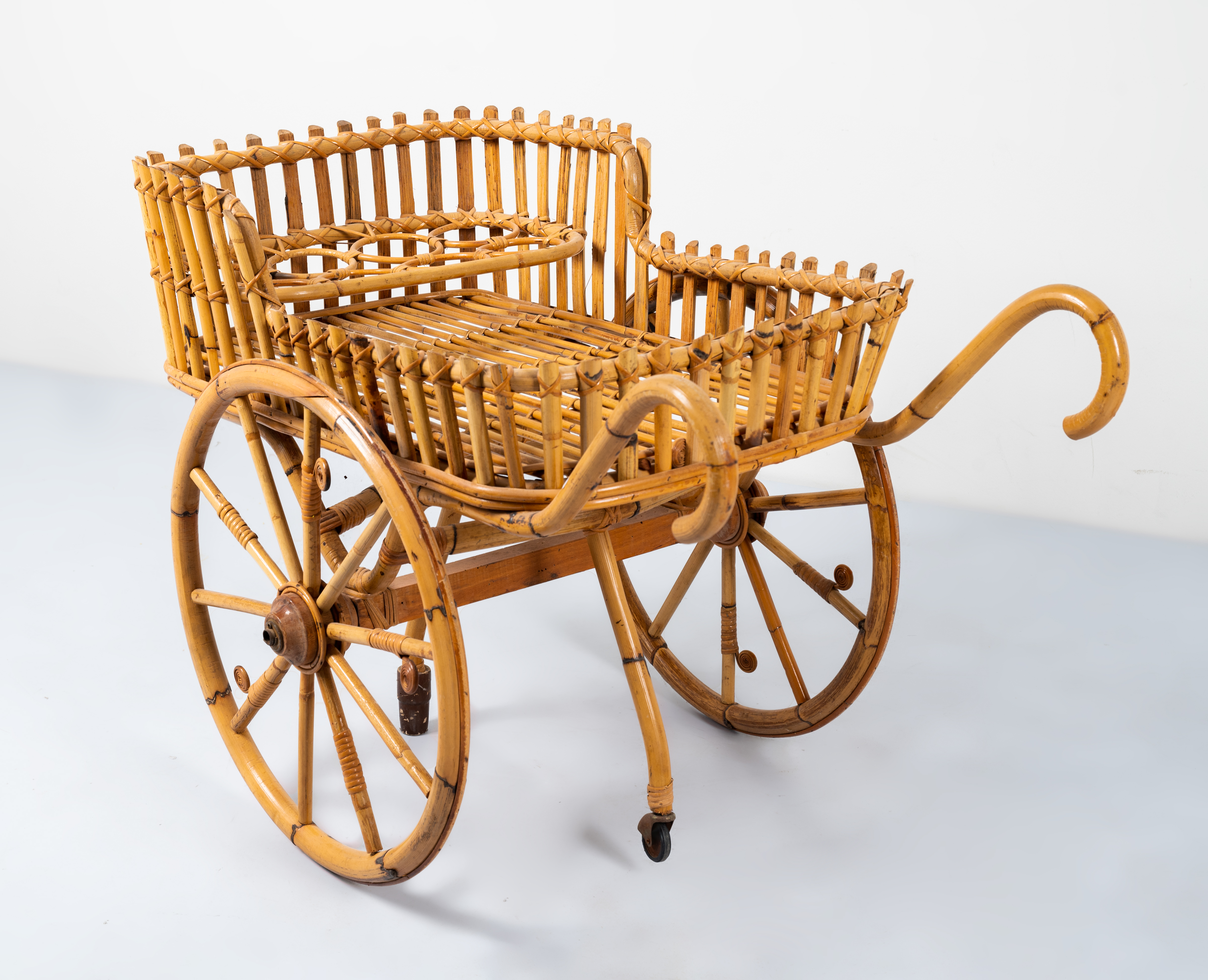 Carrello bar con struttura in bamboo e giunco, due grandi ruote circolari, vano porta bottiglie e bicchieri, minuterie in metallo.
