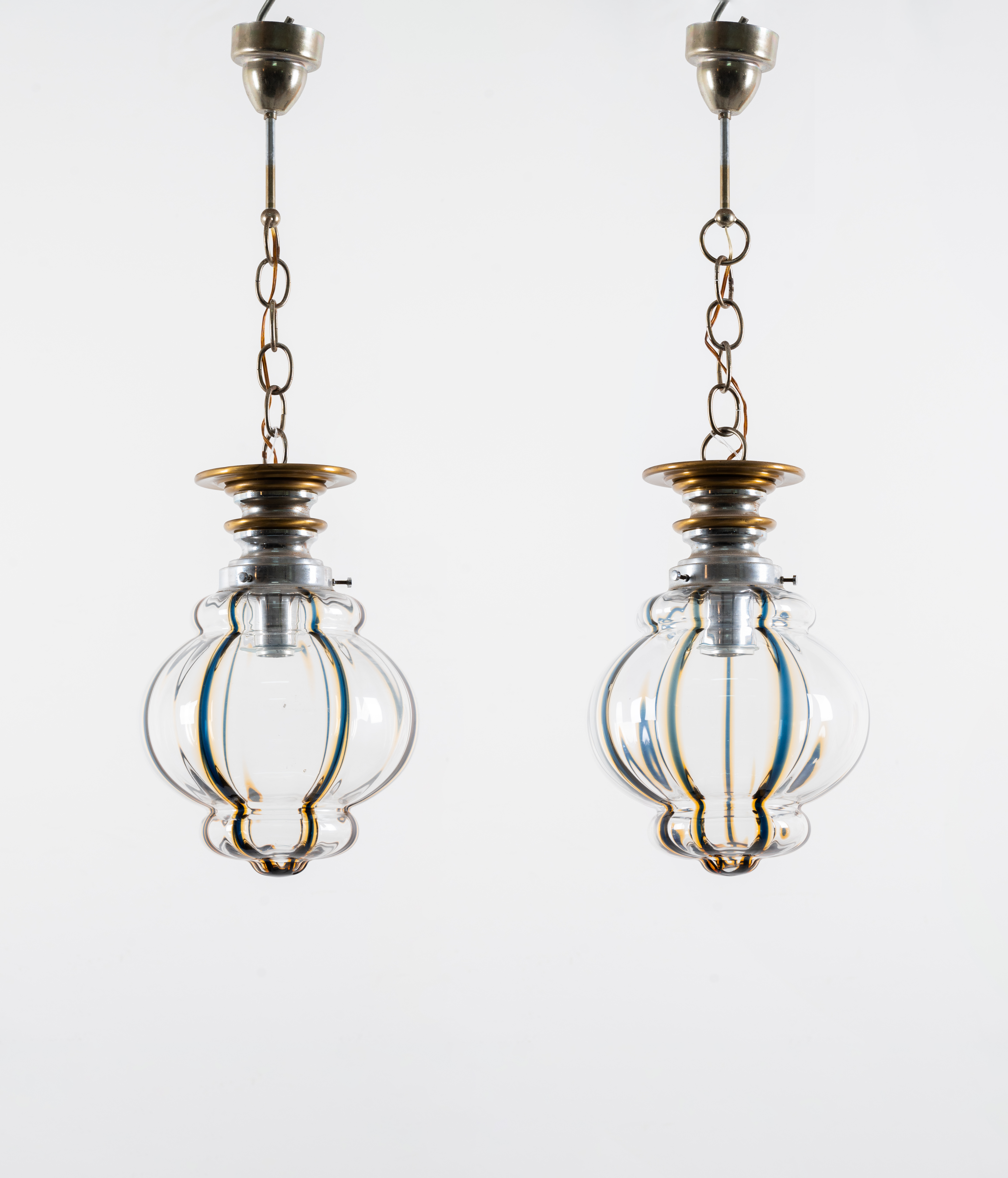 Due lampade a sospensione ad una luce con struttura in metallo cromato e dorato, diffusore sagomato in vetro incolore trasparente con rigature verticali blu e gialle.