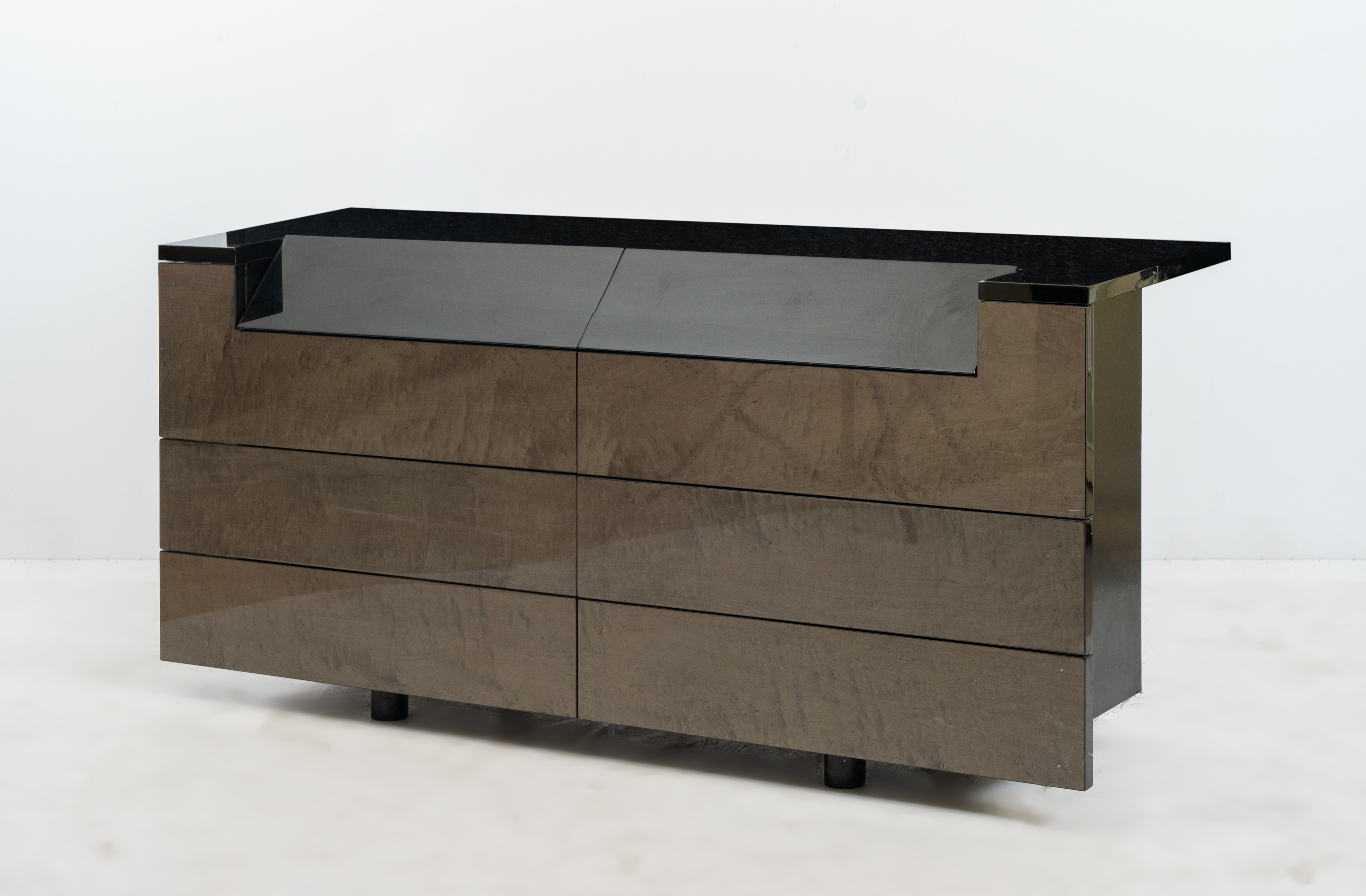 Cassettone con struttura in legno laccato nero opaco e nero lucido, sul fronte due cassetti inclinati in legno laccato nero lucido e sei cassetti in legno a finitura radica grigio perla, piano sagomato a 'C'.