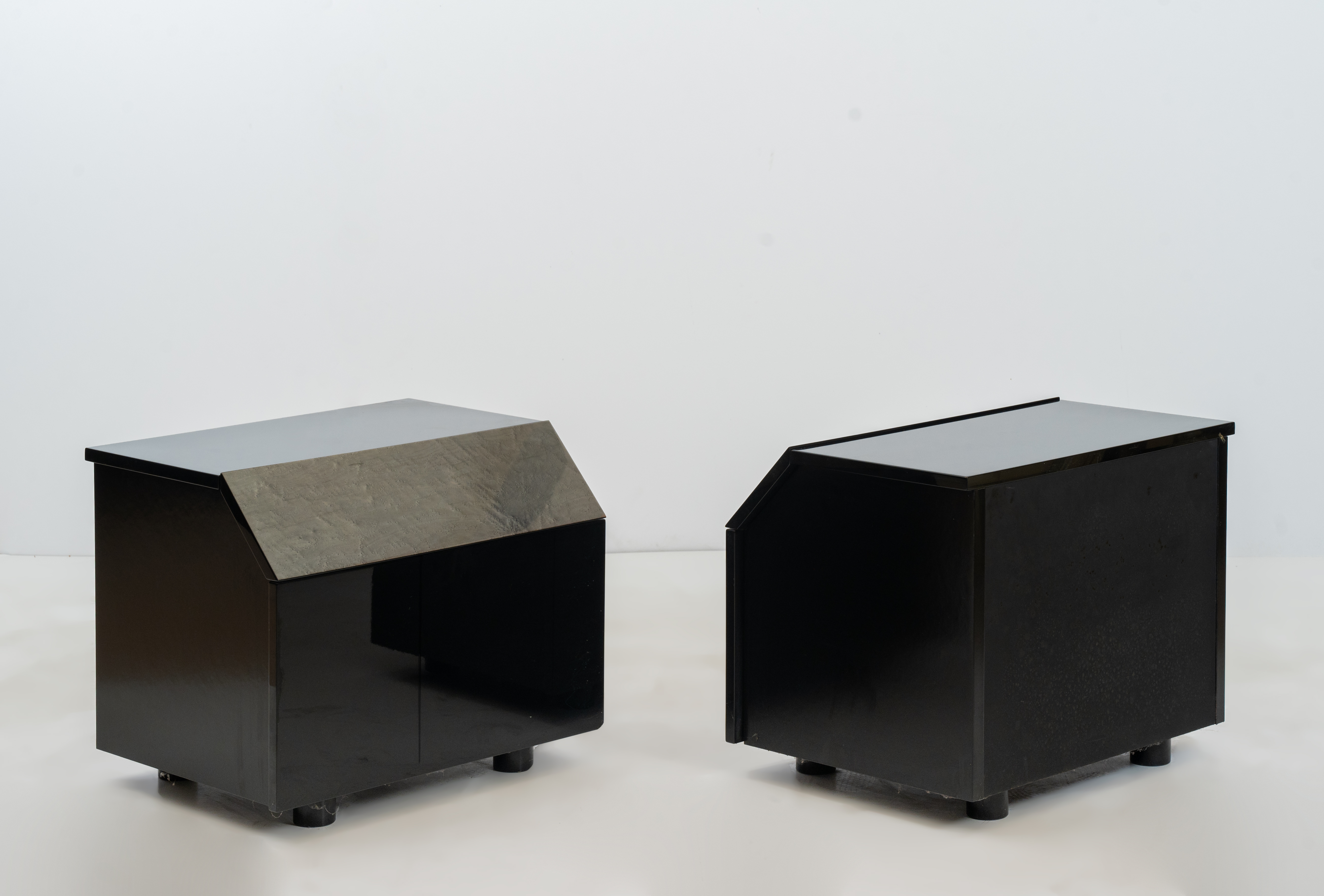 Coppia di comodini con struttura in legno laccato nero opaco e nero lucido, piano rettangolare, sul fronte un cassetto inclinato con finitura radica grigio perla ed un cassetto in legno laccato nero lucido.