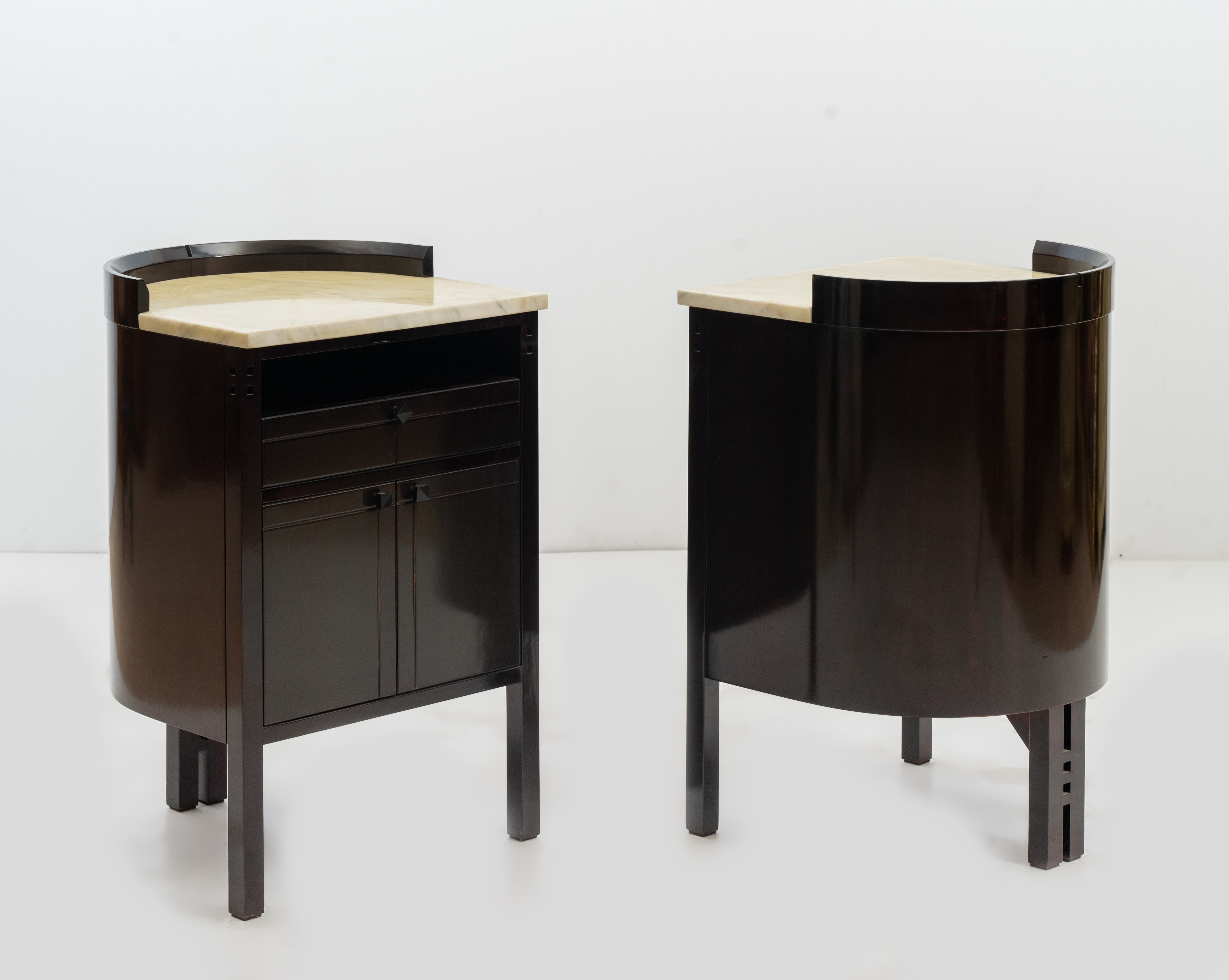 Coppia di comodini con struttura in legno di mogano ebanizzato, piano in marmo di Carrara bianco sagomato con alzata in legno semicircolare, sul fronte sotto piano a giorno, un cassetto e vano chiuso con copia di ante battenti, decori geometrici incisi.