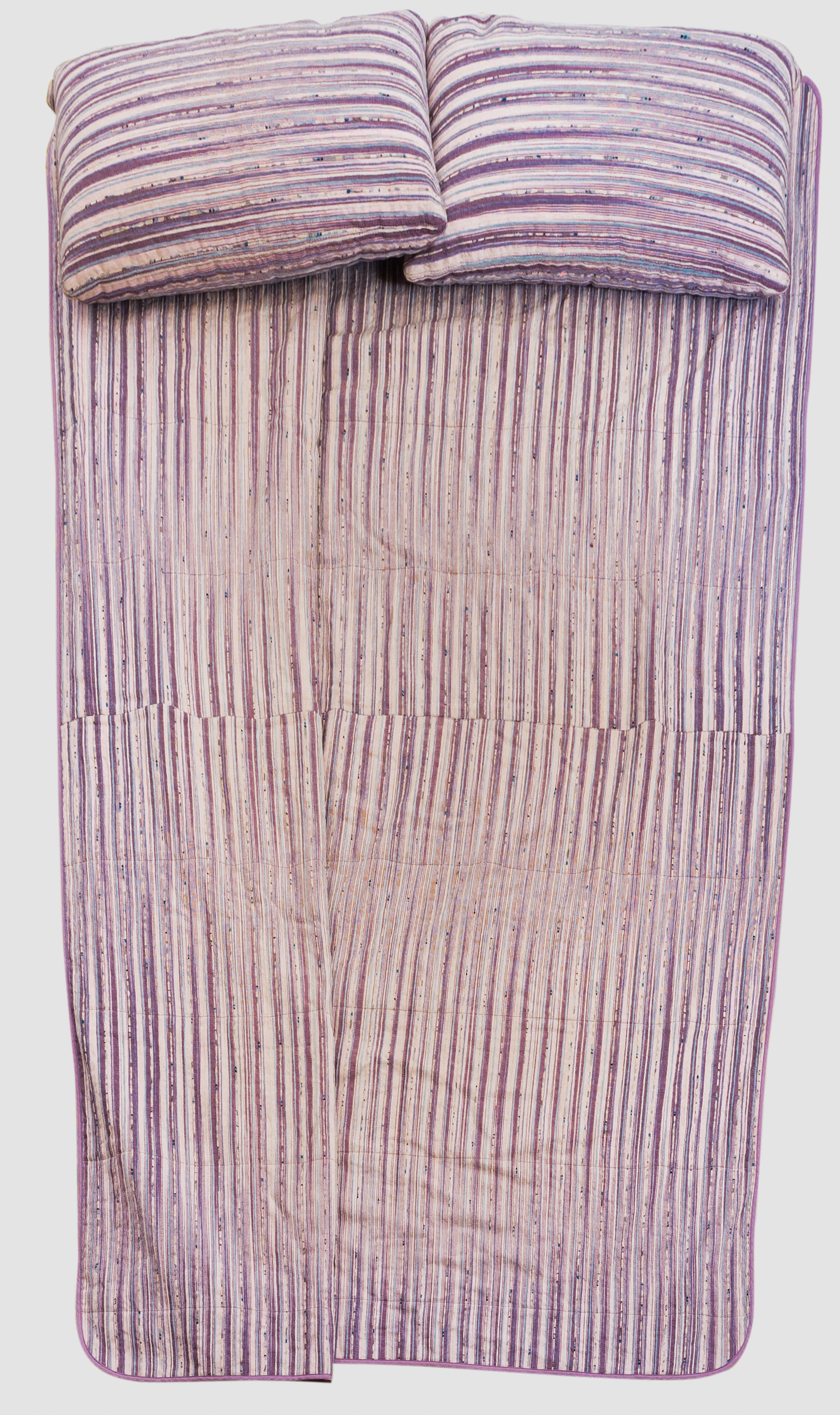 Un copriletto matrimoniale leggermente imbottito in tessuto a telaio nei toni del lilla e blu, due cuscini rettangolari con imbottitura.