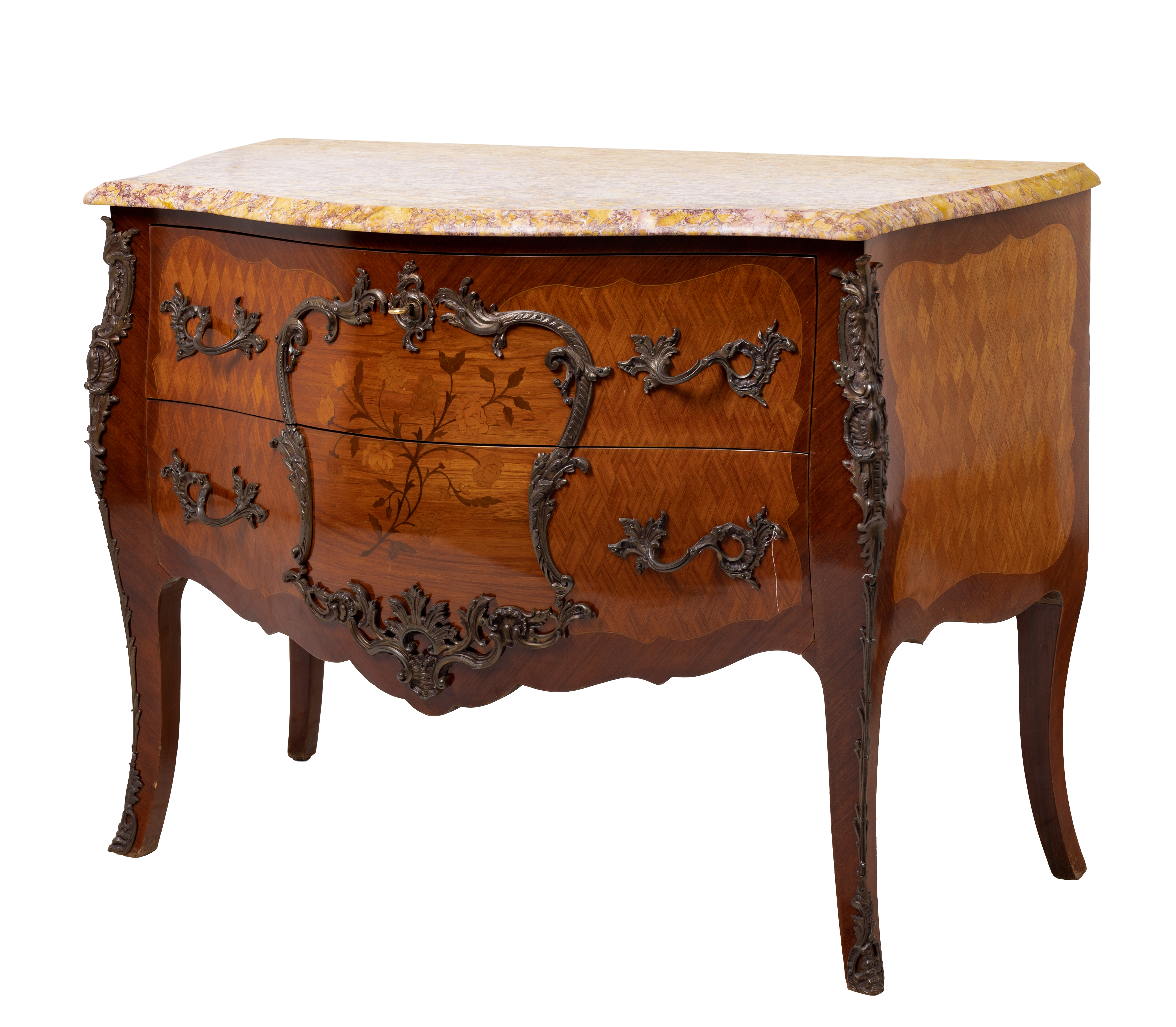 Cassettone stile Luigi XV in legno di noce e bois de rose, guarniture in bronzo, piano in marmo rosa venato.
