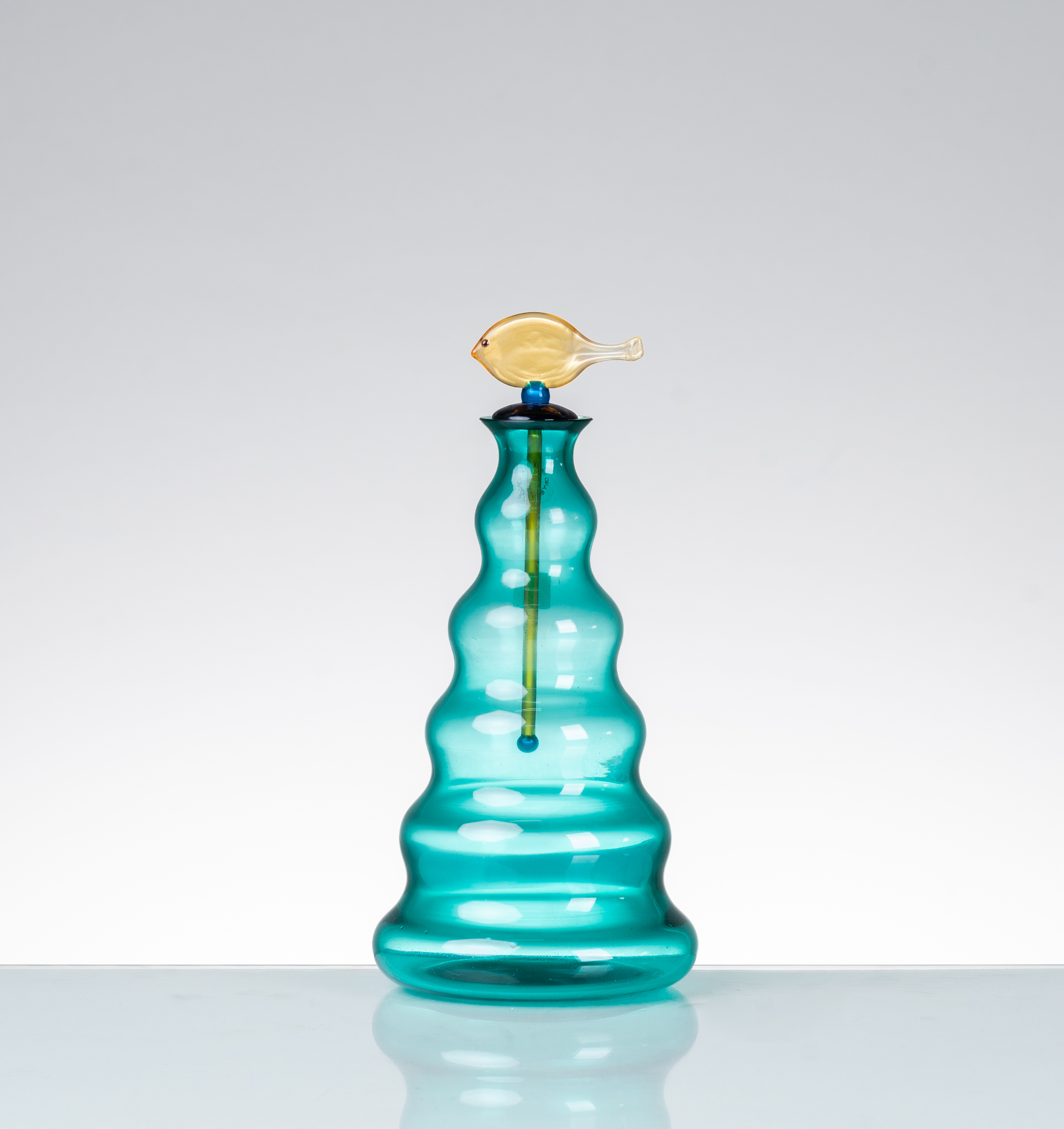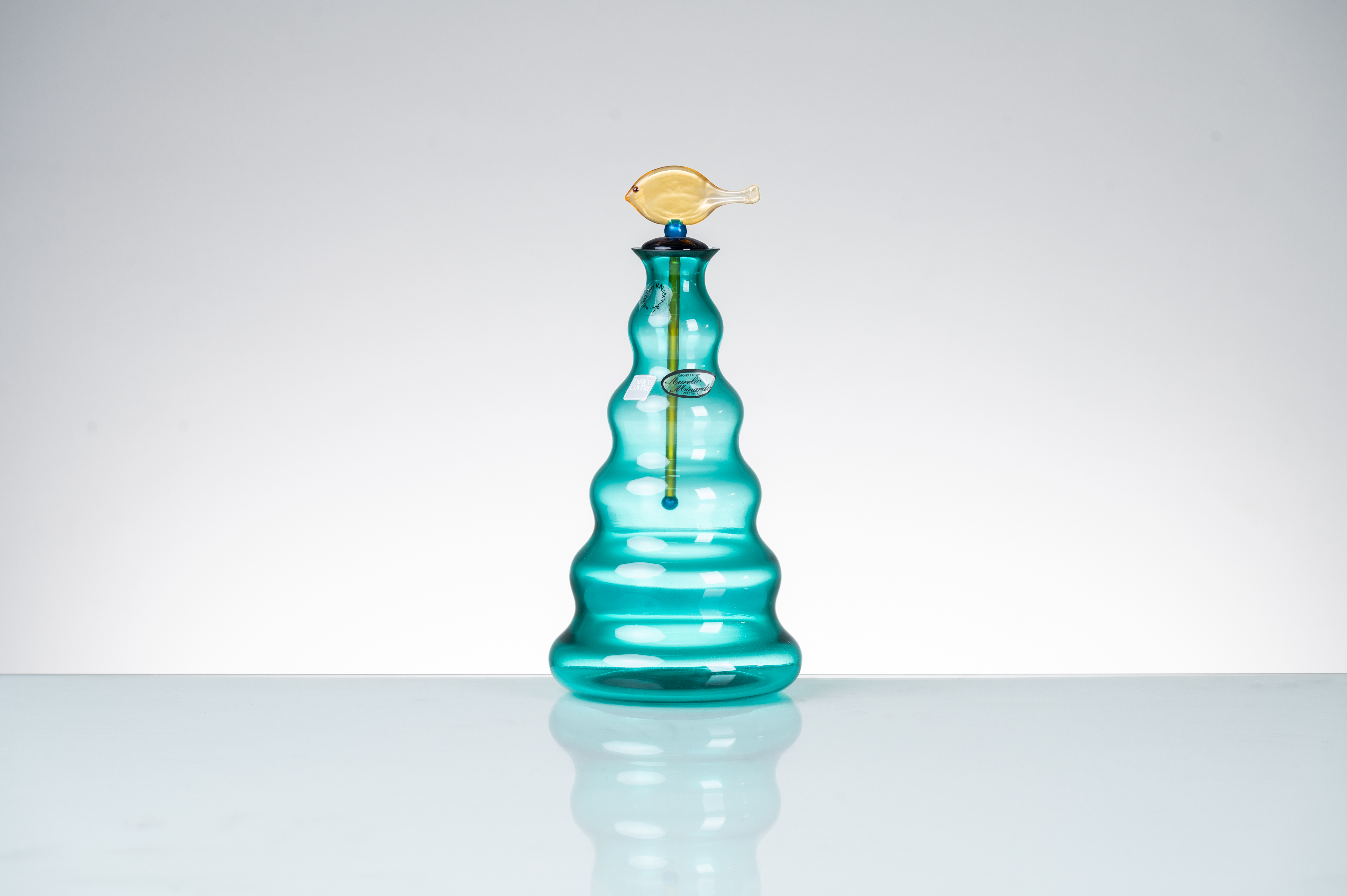 Bottiglia per profumo in vetro verde, corpo composto da anelli sovrapposti, tappo con pesce giallo su base blu. Firma a graffio ed etichetta adesiva.