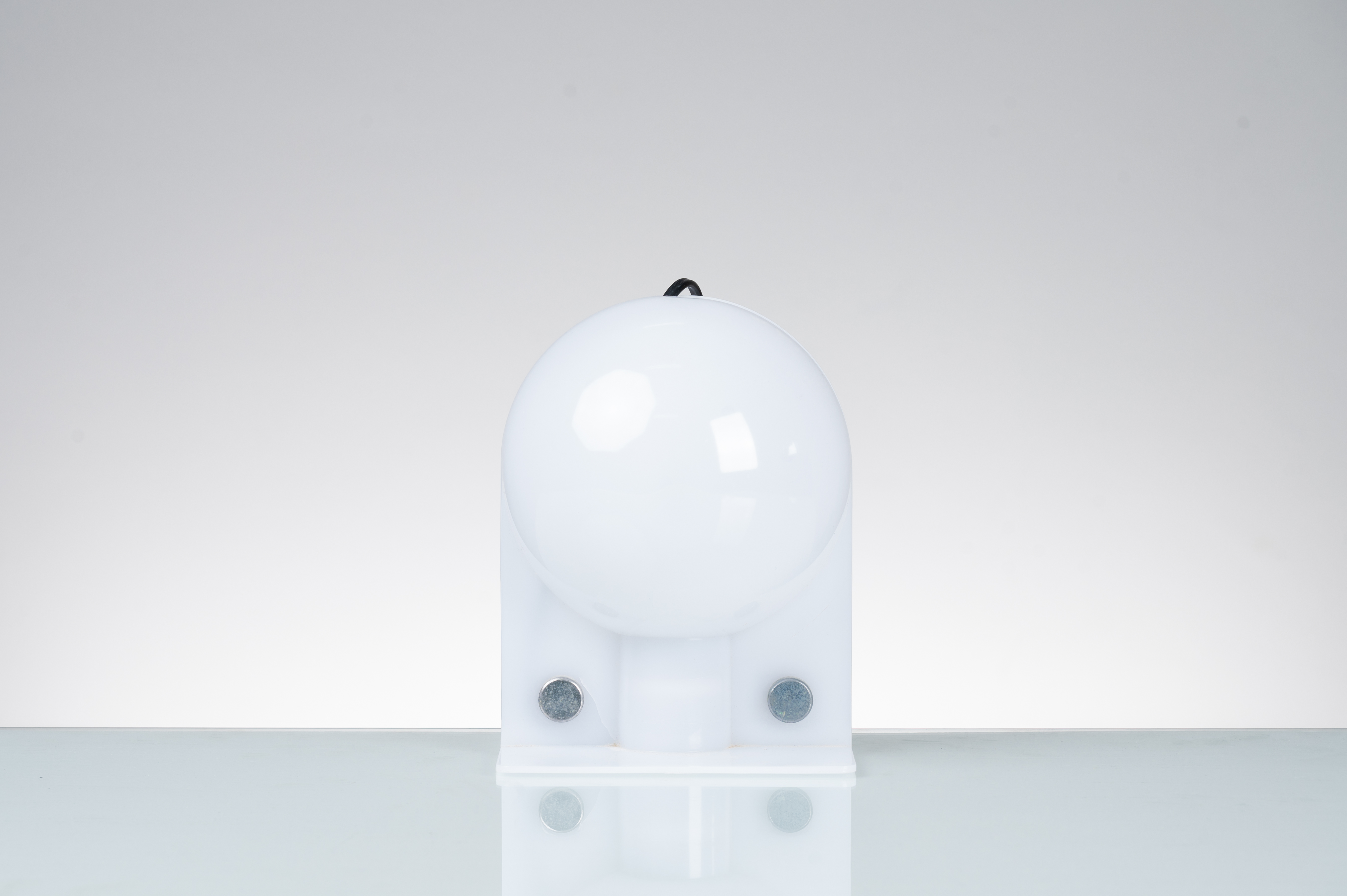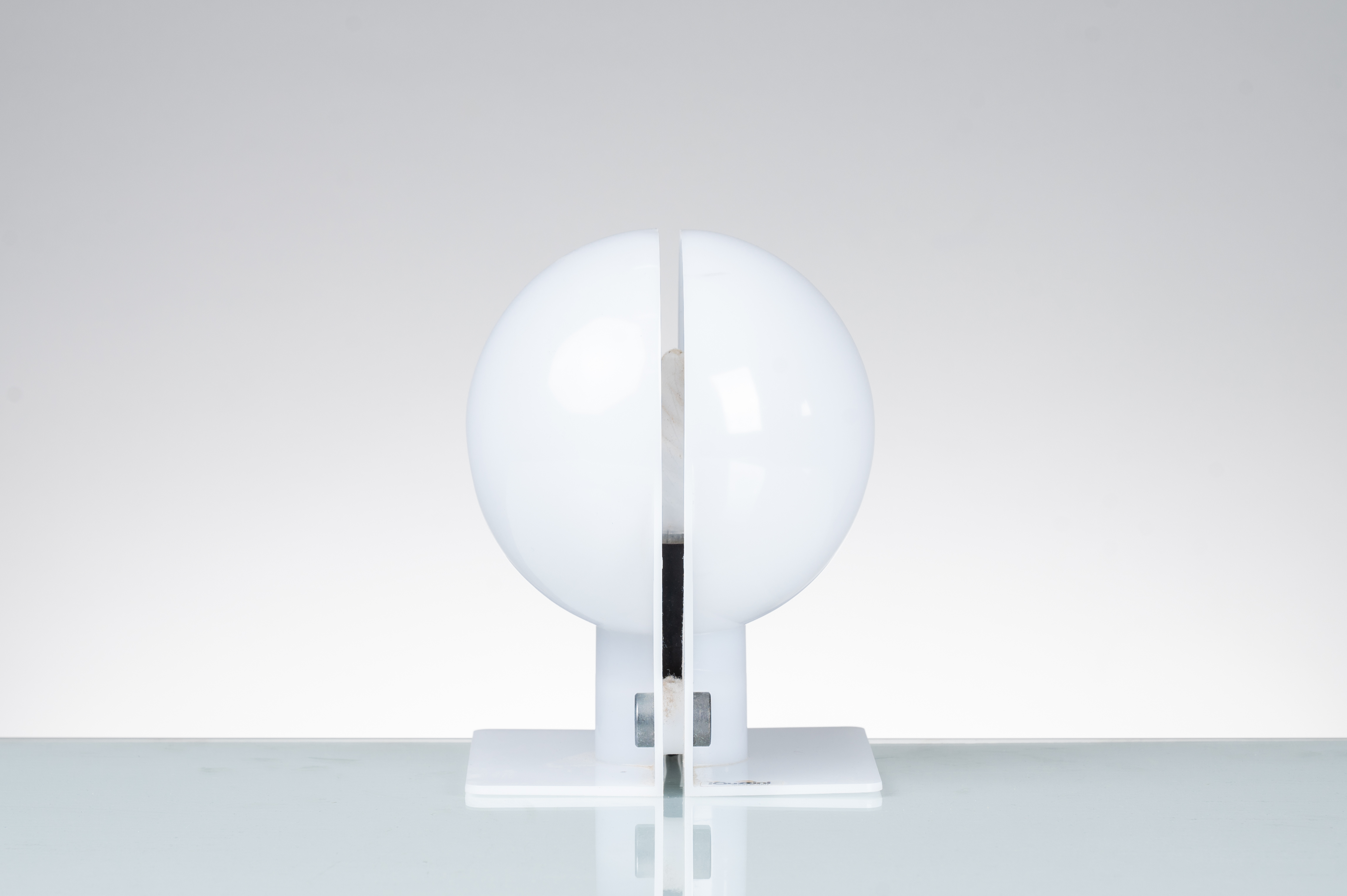 Lampada da tavolo ad una luce modello “Sirio”, struttura e diffusore globulare in metacrilato bianco, minuterie in metallo cromato. Etichetta di produzione.