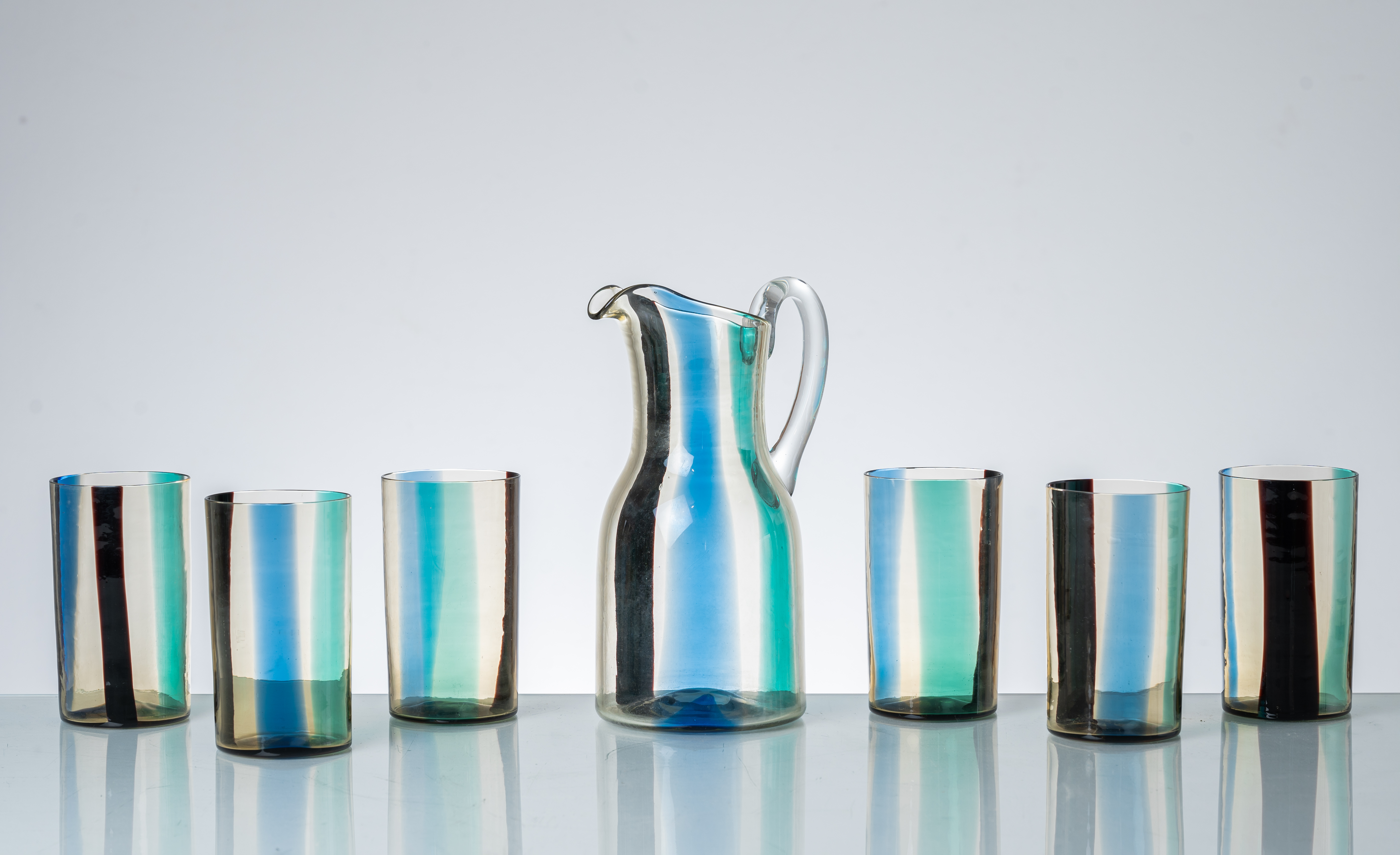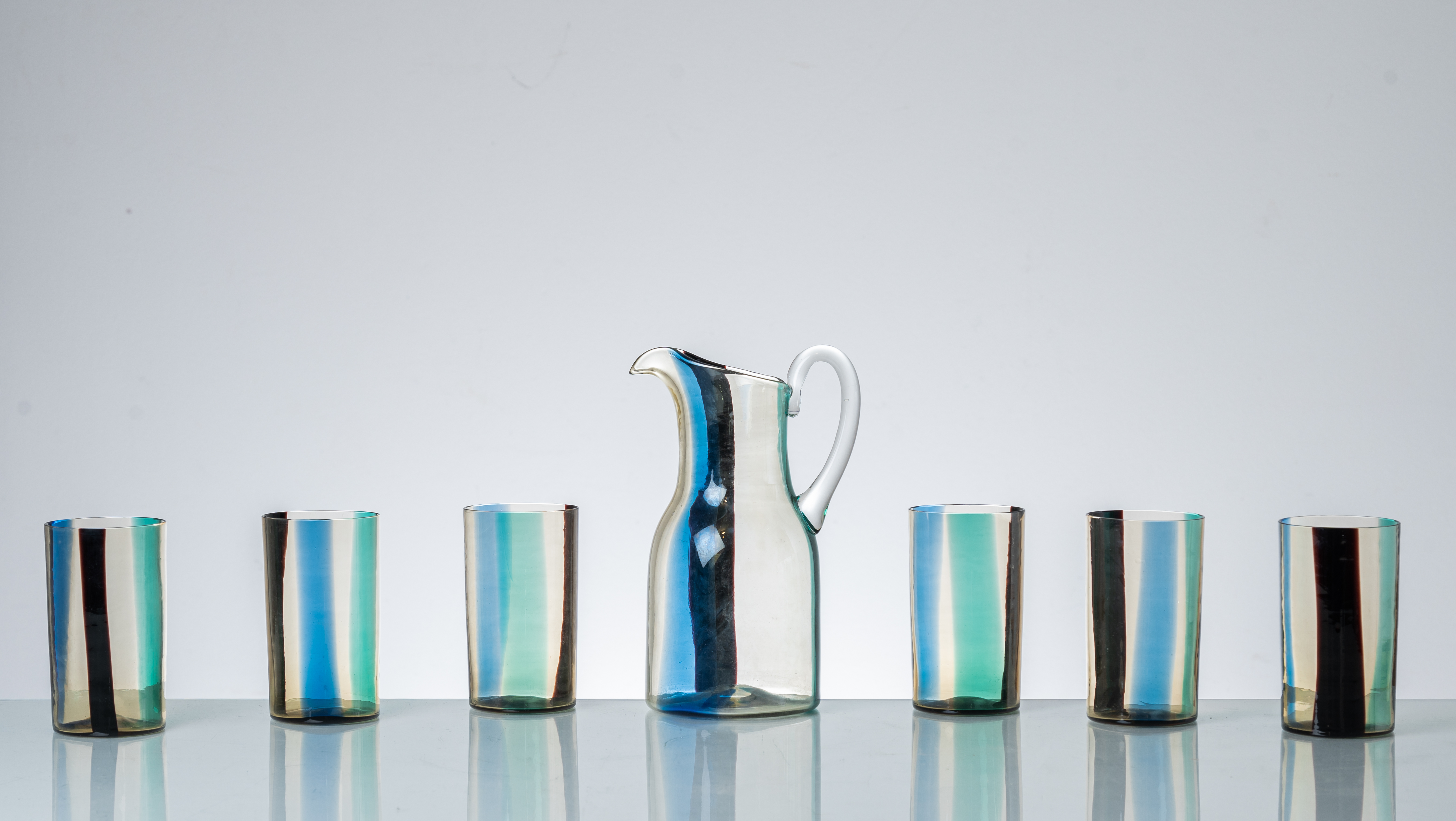 FULVIO BIANCONI, Caraffa con sei bicchieri in vetro