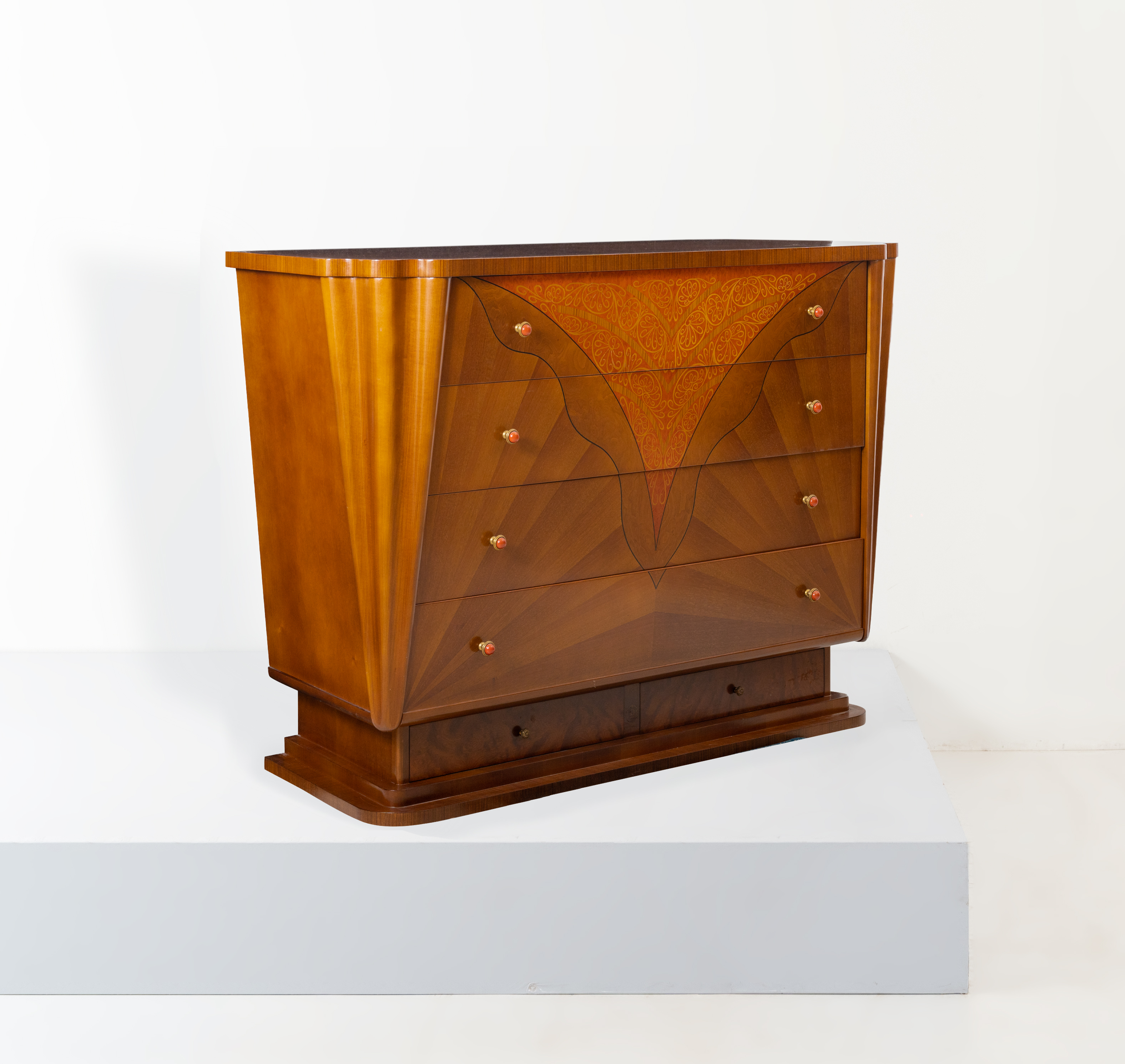 Cassettone modello "Fusion" di gusto decò in legno di noce e radica, piano rettangolare con sagomature angolari, sul fronte quattro cassetti decorati con tarsie e volute e due cassetti sottostanti, minuterie in metallo.