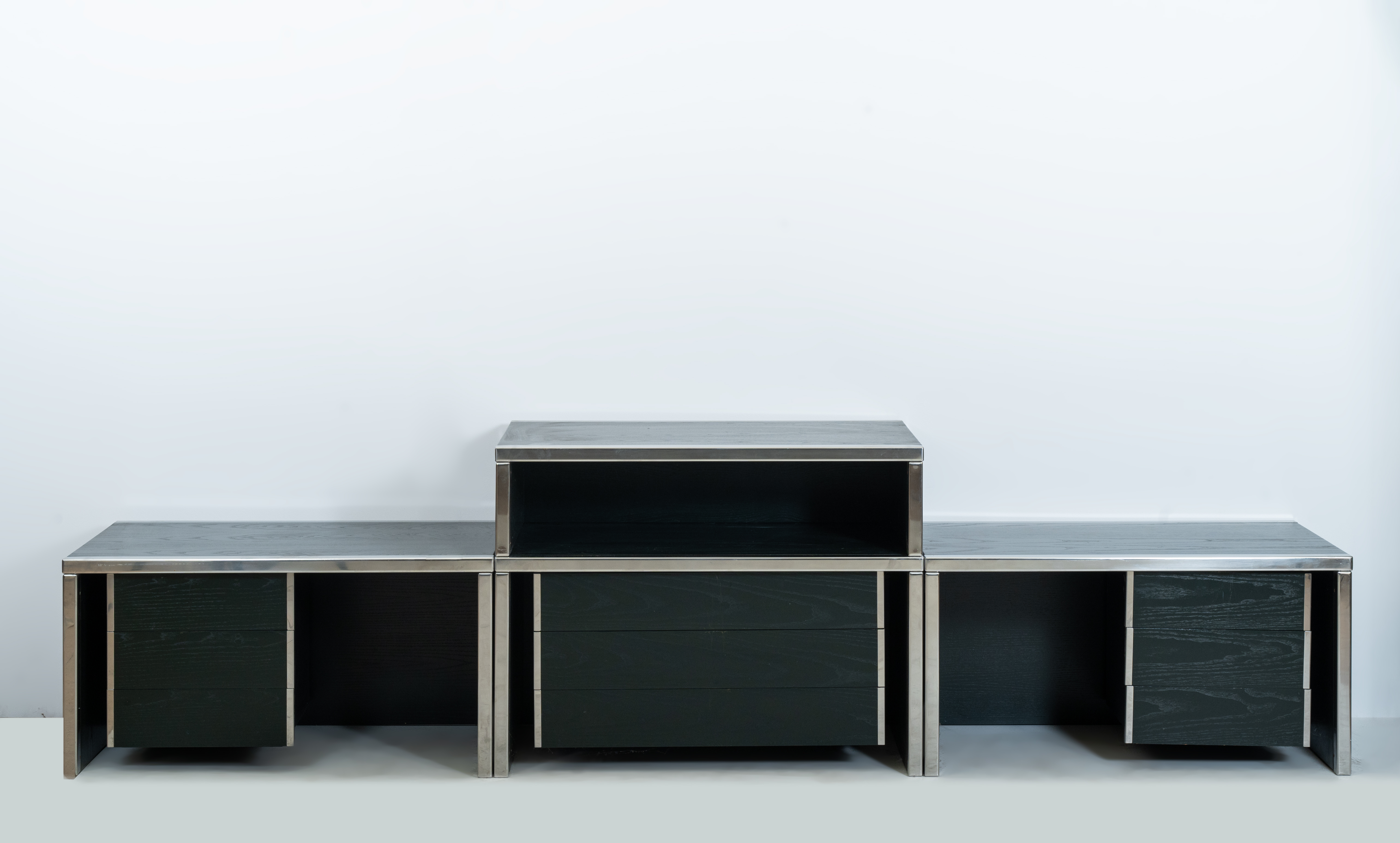 Quattro moduli componibili composti da tre elementi bassi ed un'alzata mobile con struttura in metallo cromato e legno in venatura verde. Due moduli bassi sul fronte presentano tre cassetti ed un vano a giorno, un modulo presenta tre cassetti.