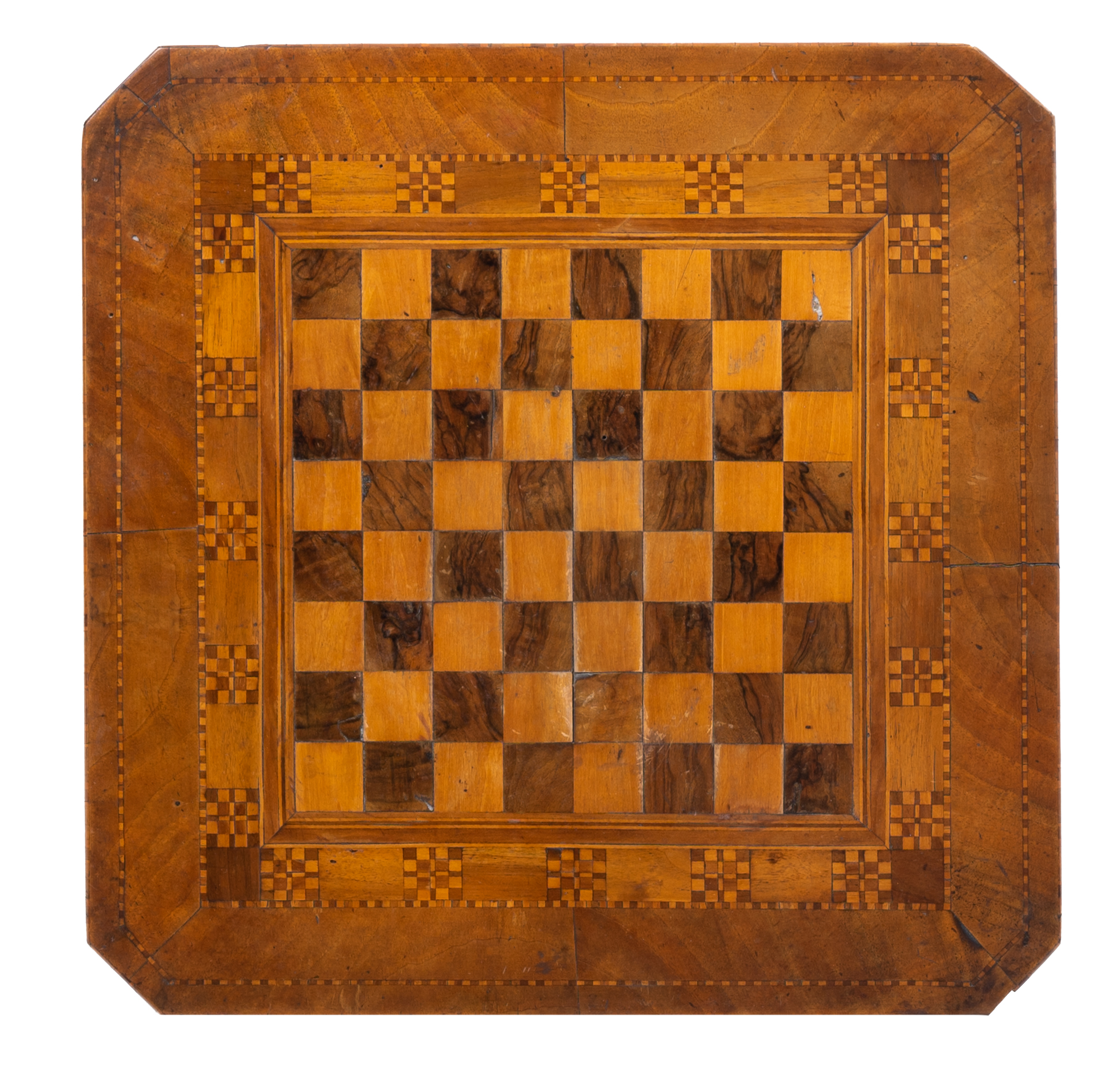 Tavolino di forma quadrata con piano a scacchiera in legno di noce e radica di noce, tarsie in bosso.