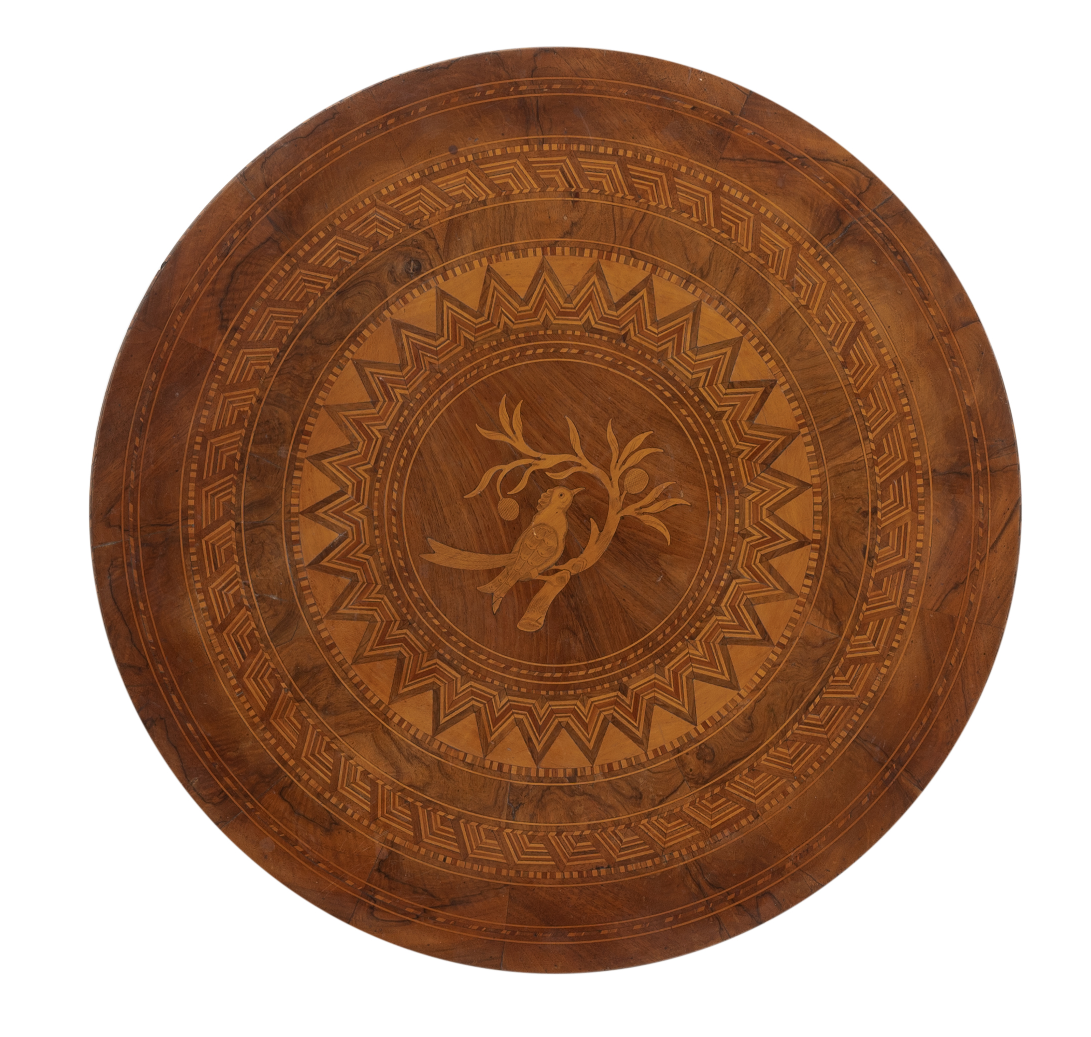 Tavolino sorrentino in legno di noce, tarsie in legno di bosso a motivo geometrico, disegno al centro raffigurante "Ramo con volatile".