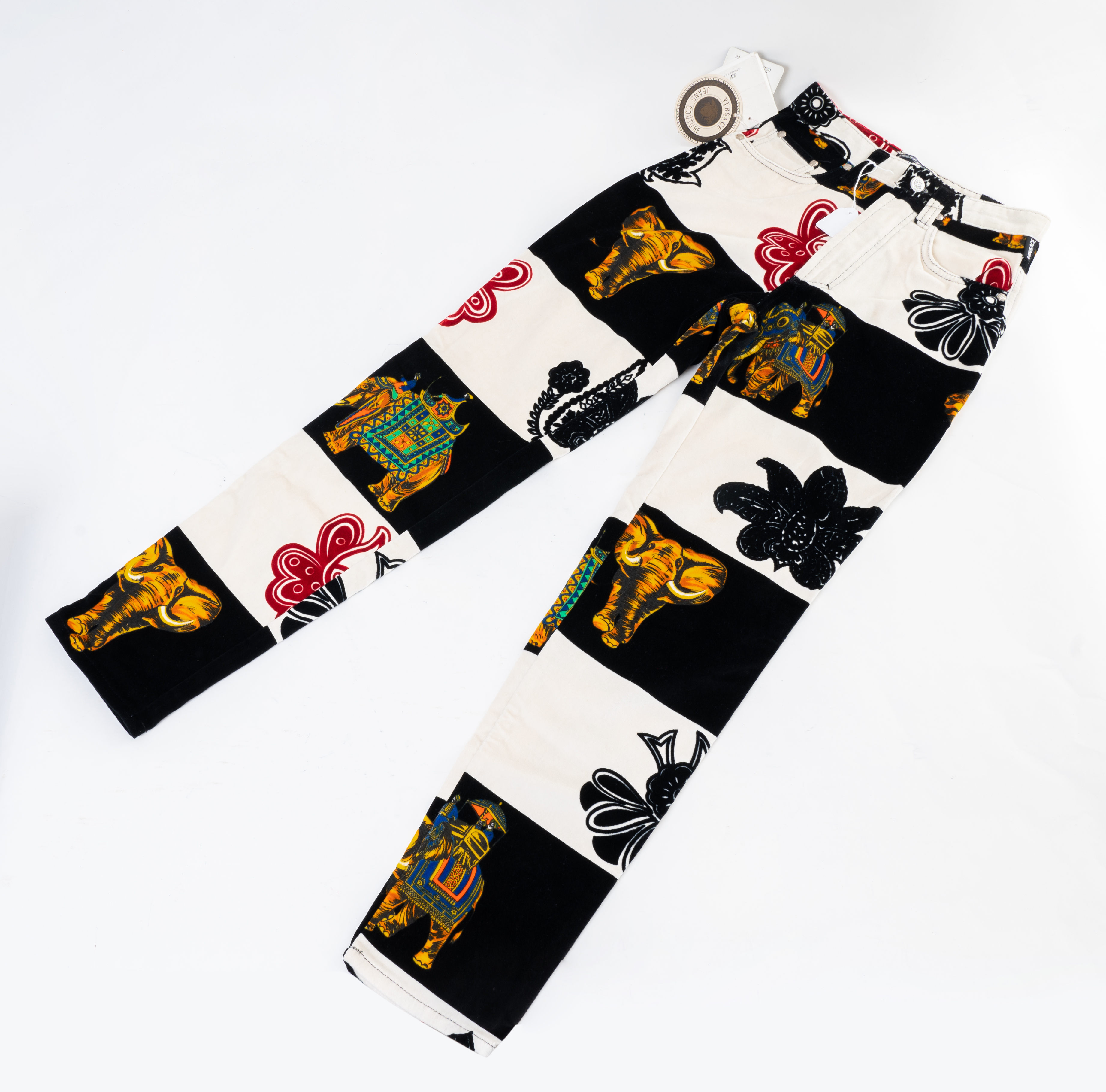 Jeans couture a stampa policroma con elefanti e motivi geometrici bianchi e neri, mai indossati. Taglia 26. Etichette e marchio di produzione.