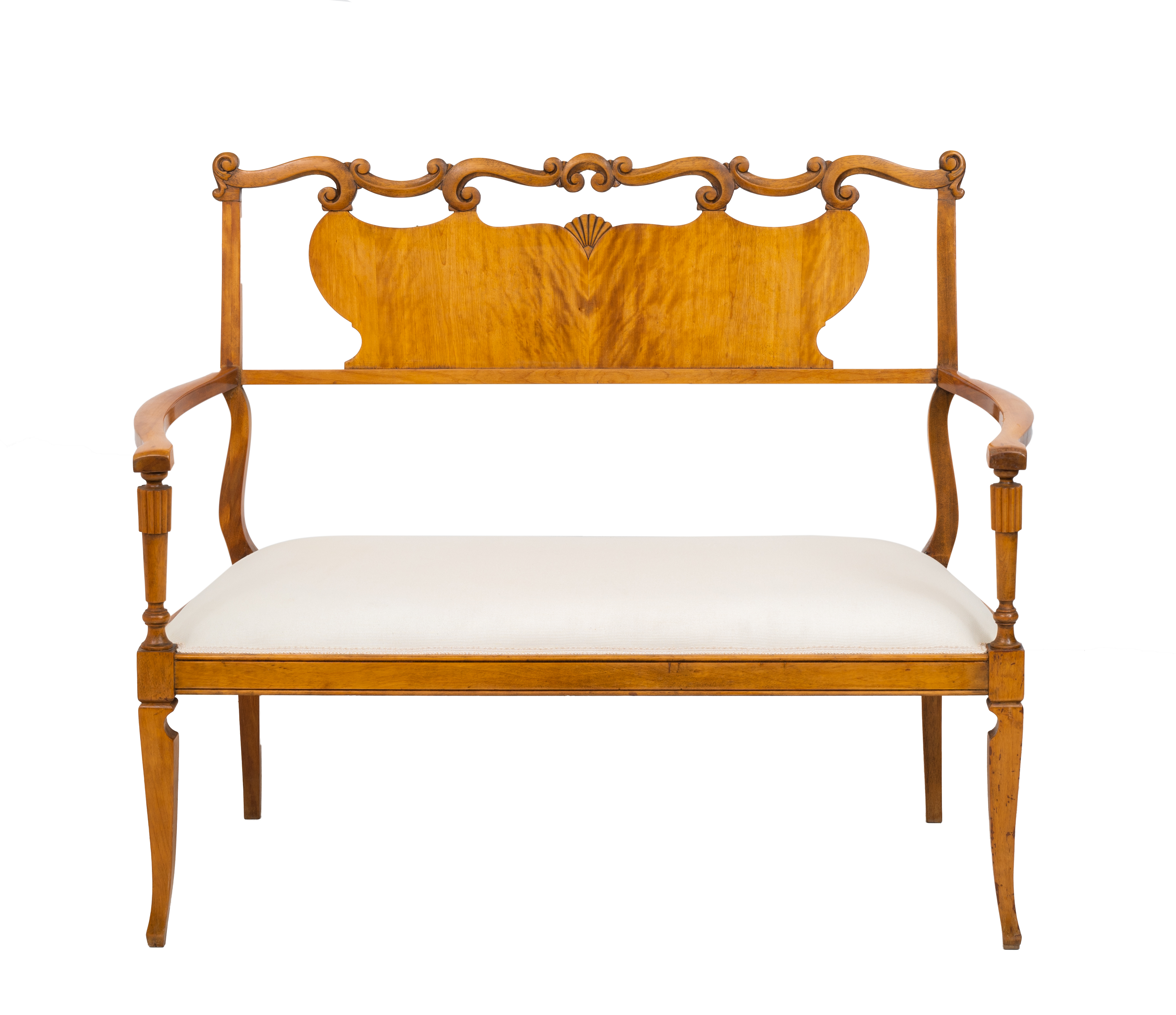 Divano Biedermeier a due posti in legno di acero, seduta imbottita.