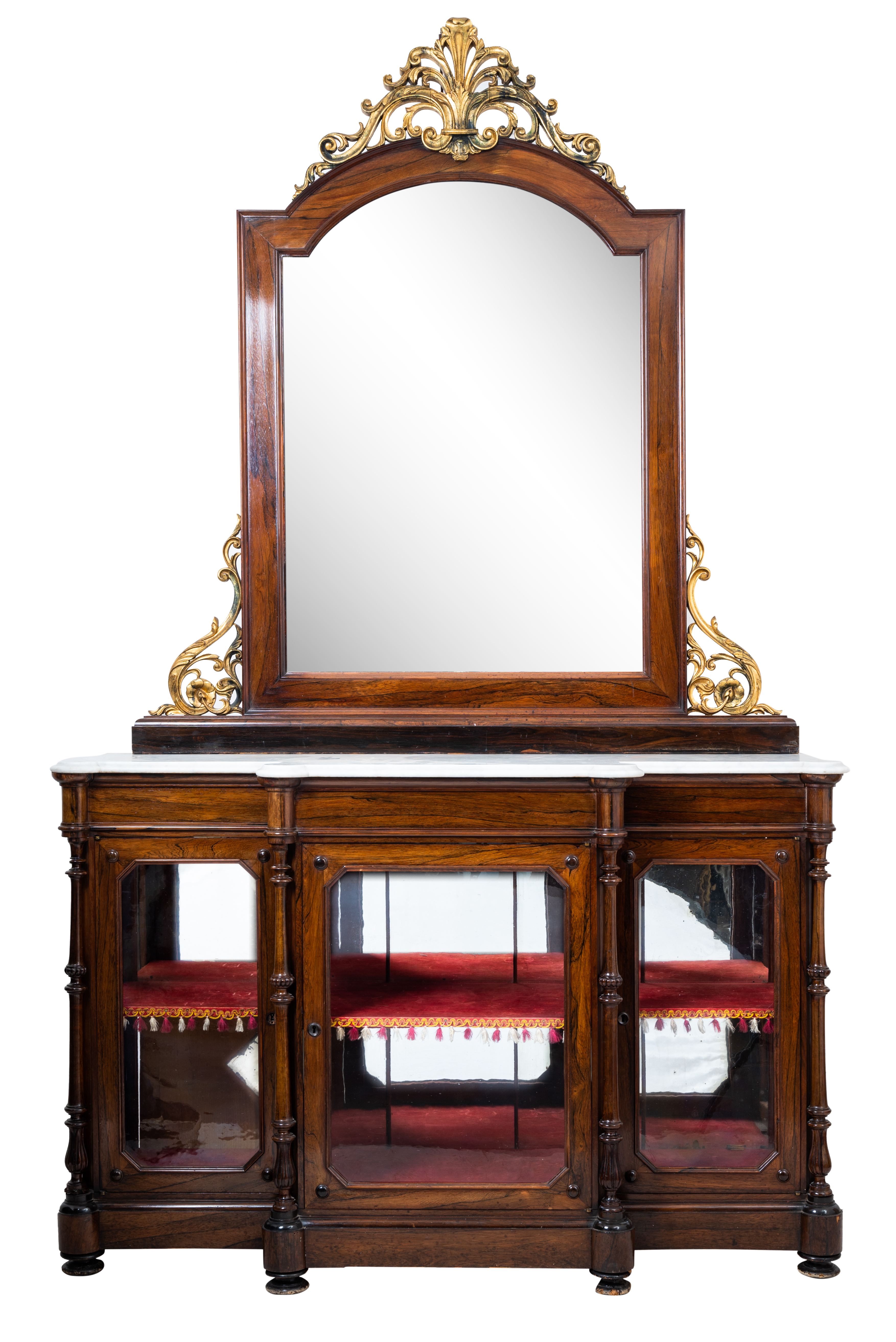 Etagere con specchiera in legno esotico a tre ante, piano in marmo bianco di Carrara.