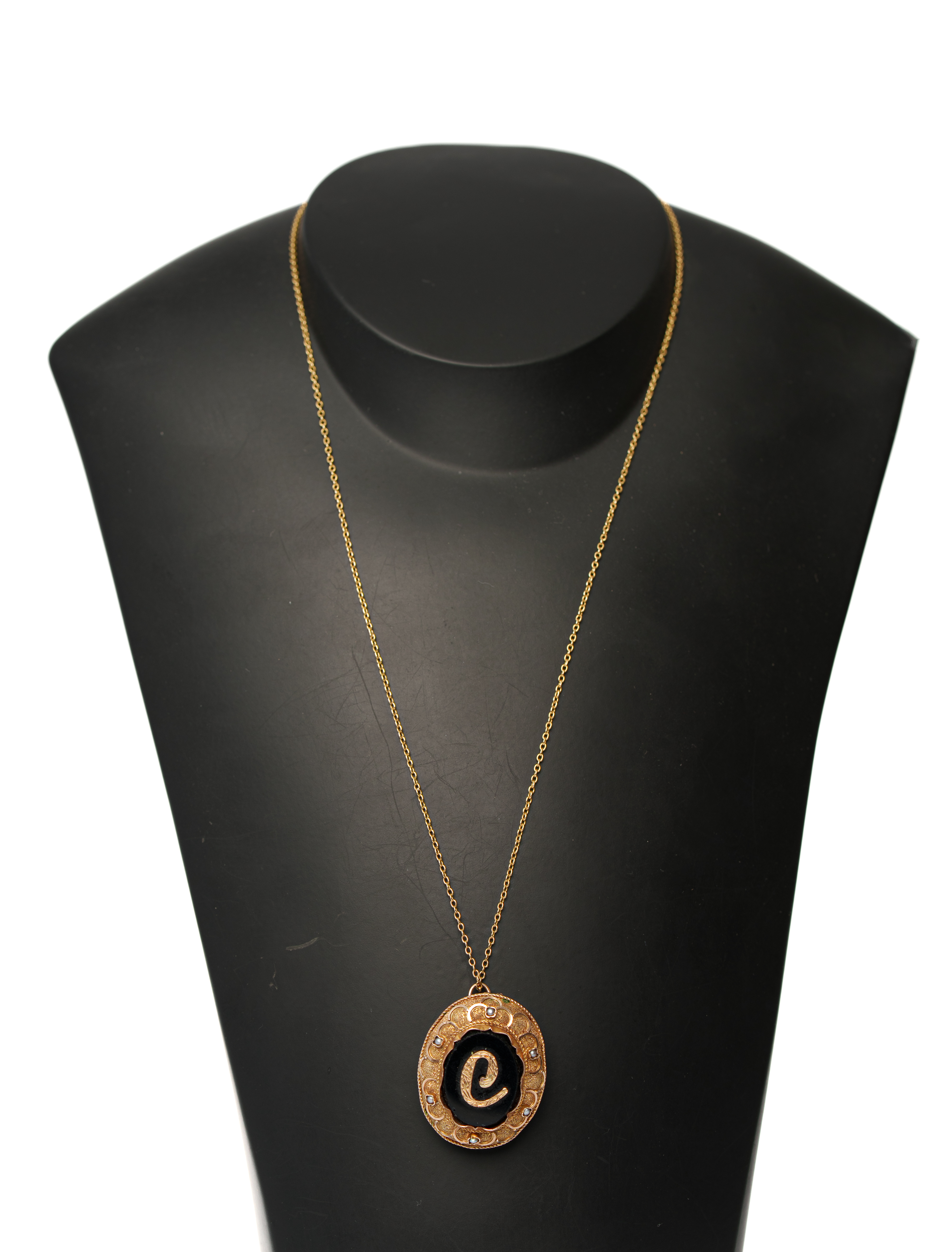 COLLANA con ciondolo portafoto in oro giallo 9 KT e 18 KT con onice e microperline (g. 12,50).