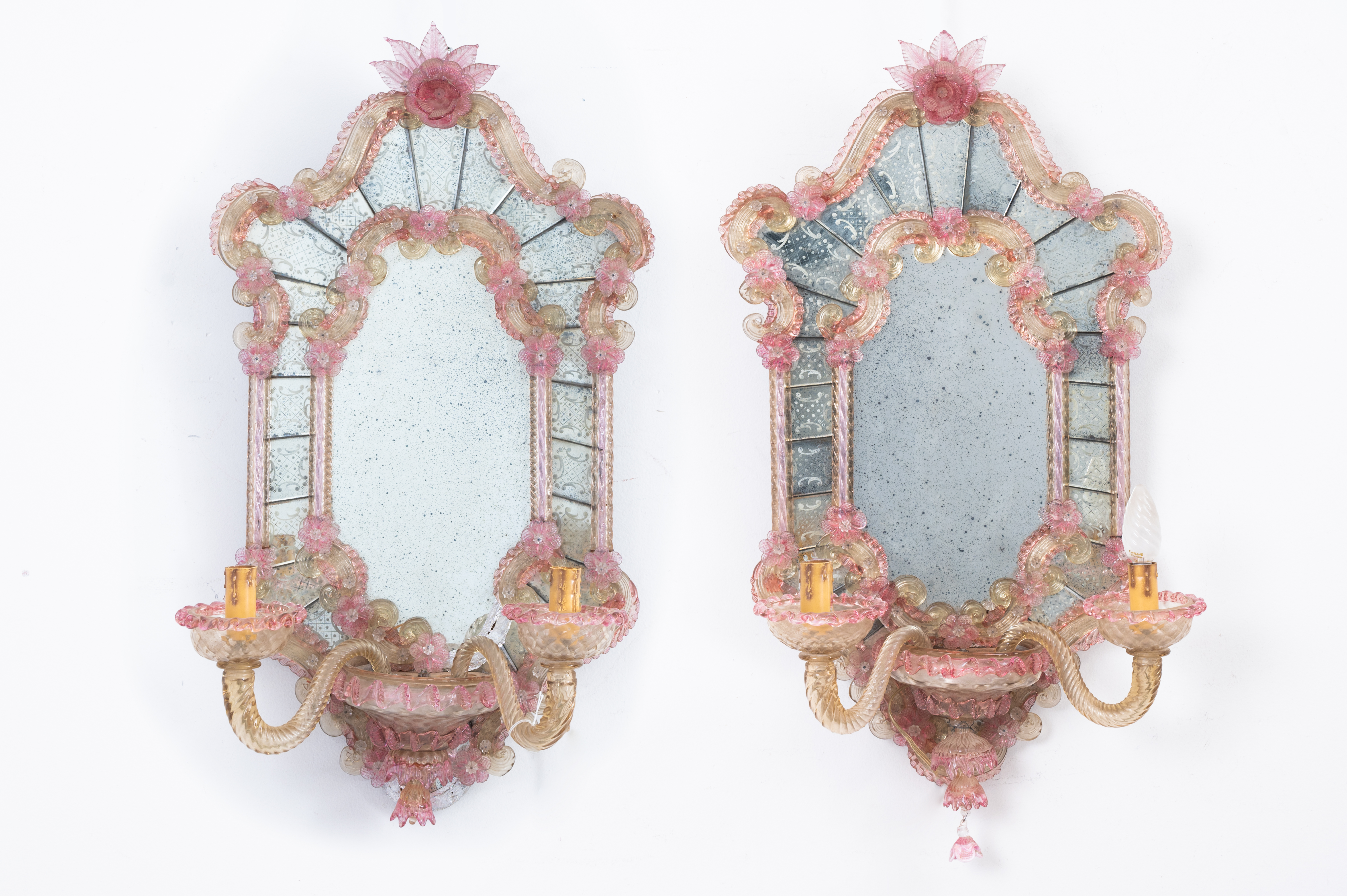 Coppia di specchiere in vetro nei toni del rosa con due bracci ad applique (usure e mancanze).