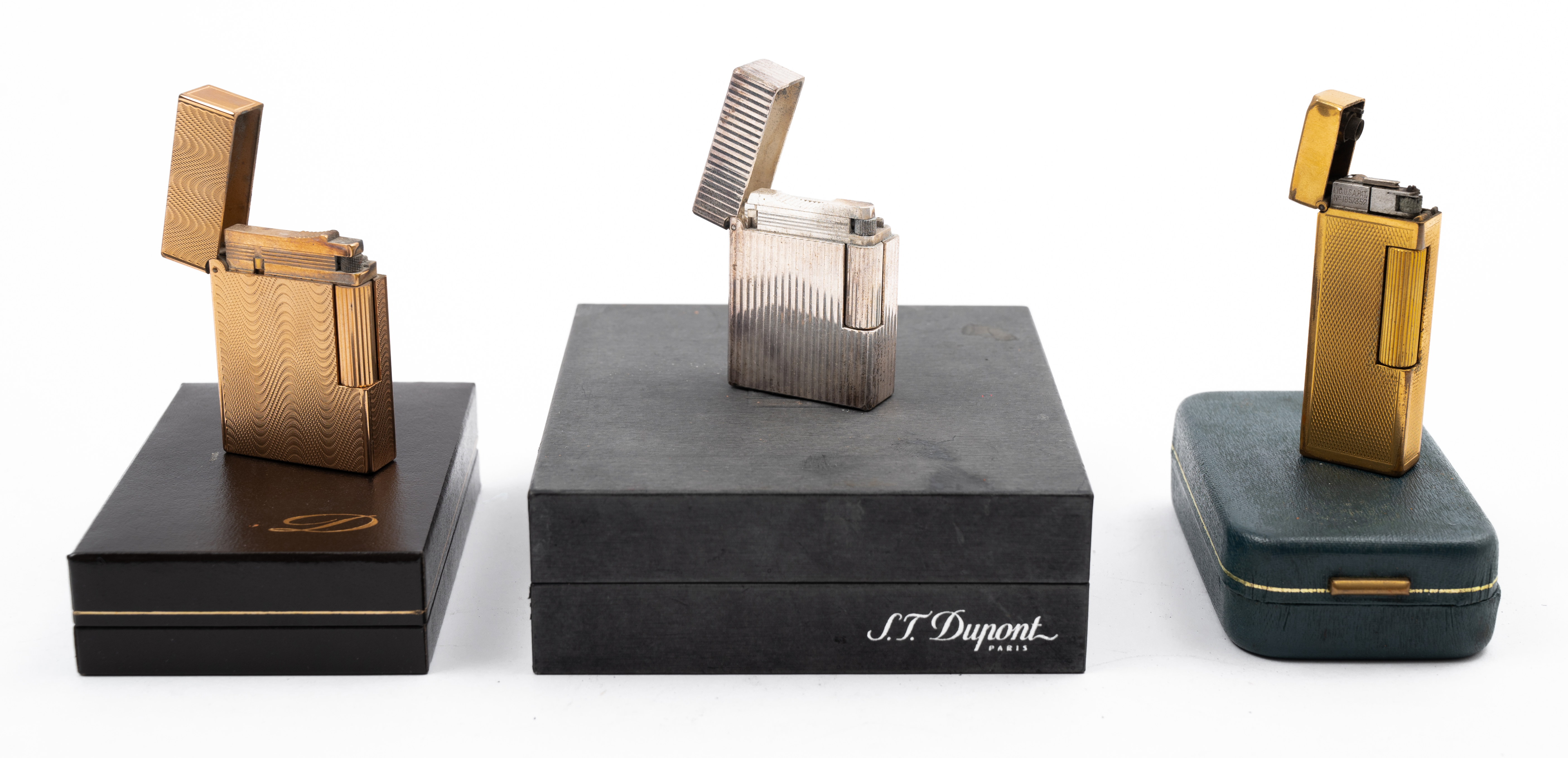 Accendino Dupont placcato oro con scatola originale, accendino Dunhill placcato oro con scatola originale e accendino Dupont in metallo argentato con scatola originale (usure e da revisionare).