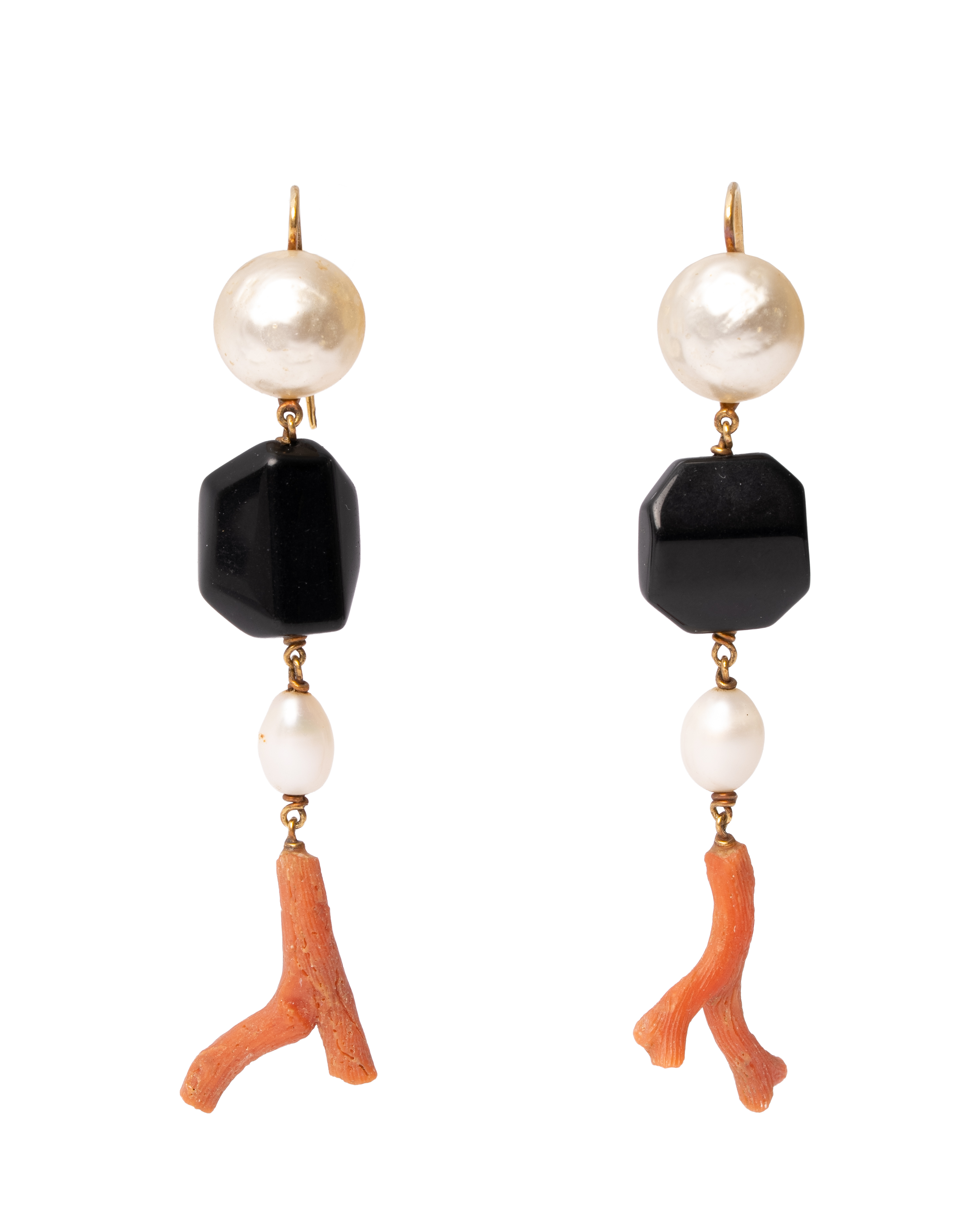 ORECCHINI in oro giallo 18 KT con onice, perle di fiume e tralci di corallo (g. 21.10).