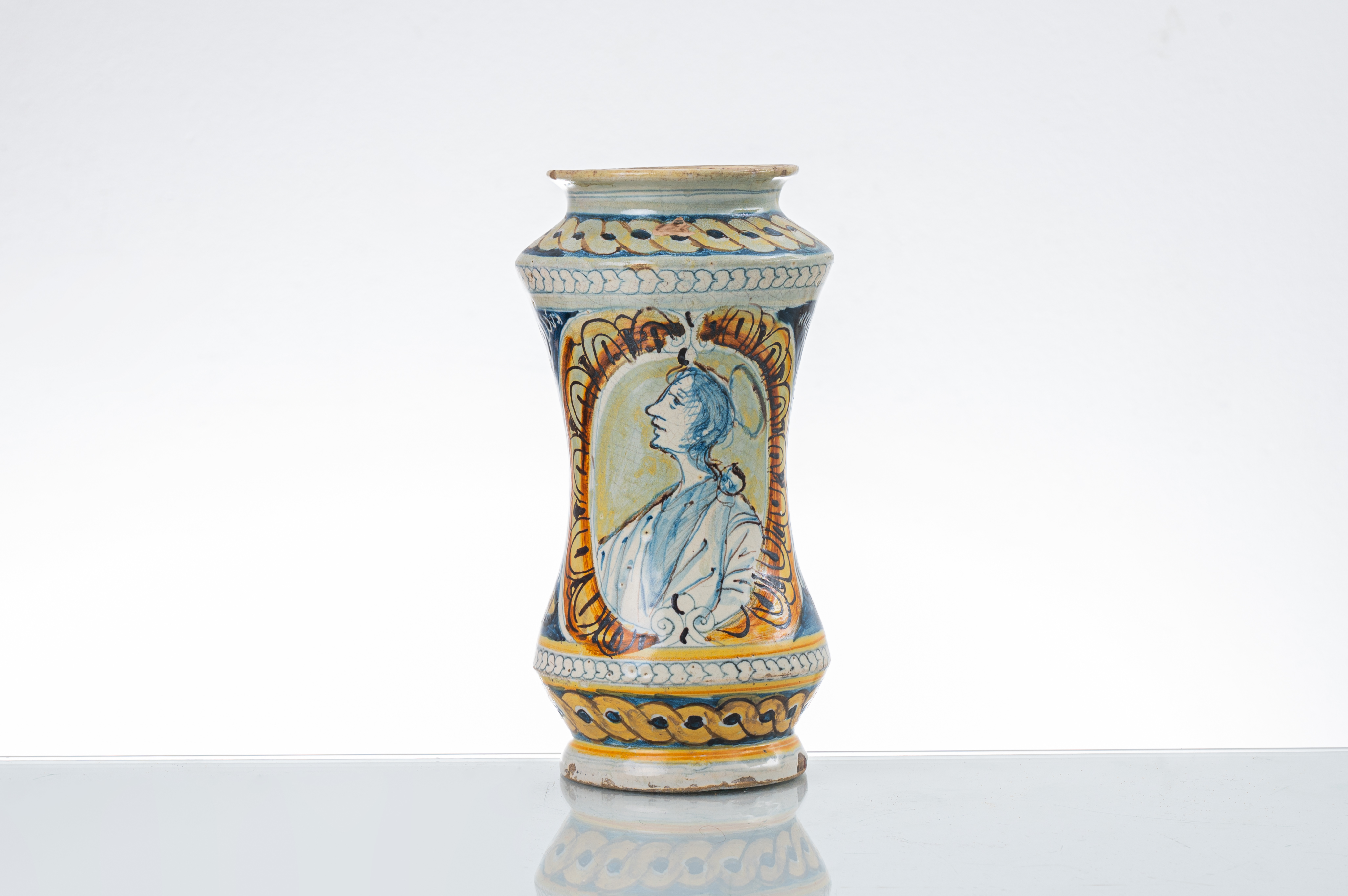 Albarello in ceramica decorata e dipinta, medaglione centrale raffigurante "Santo" (usure e mancanze).
