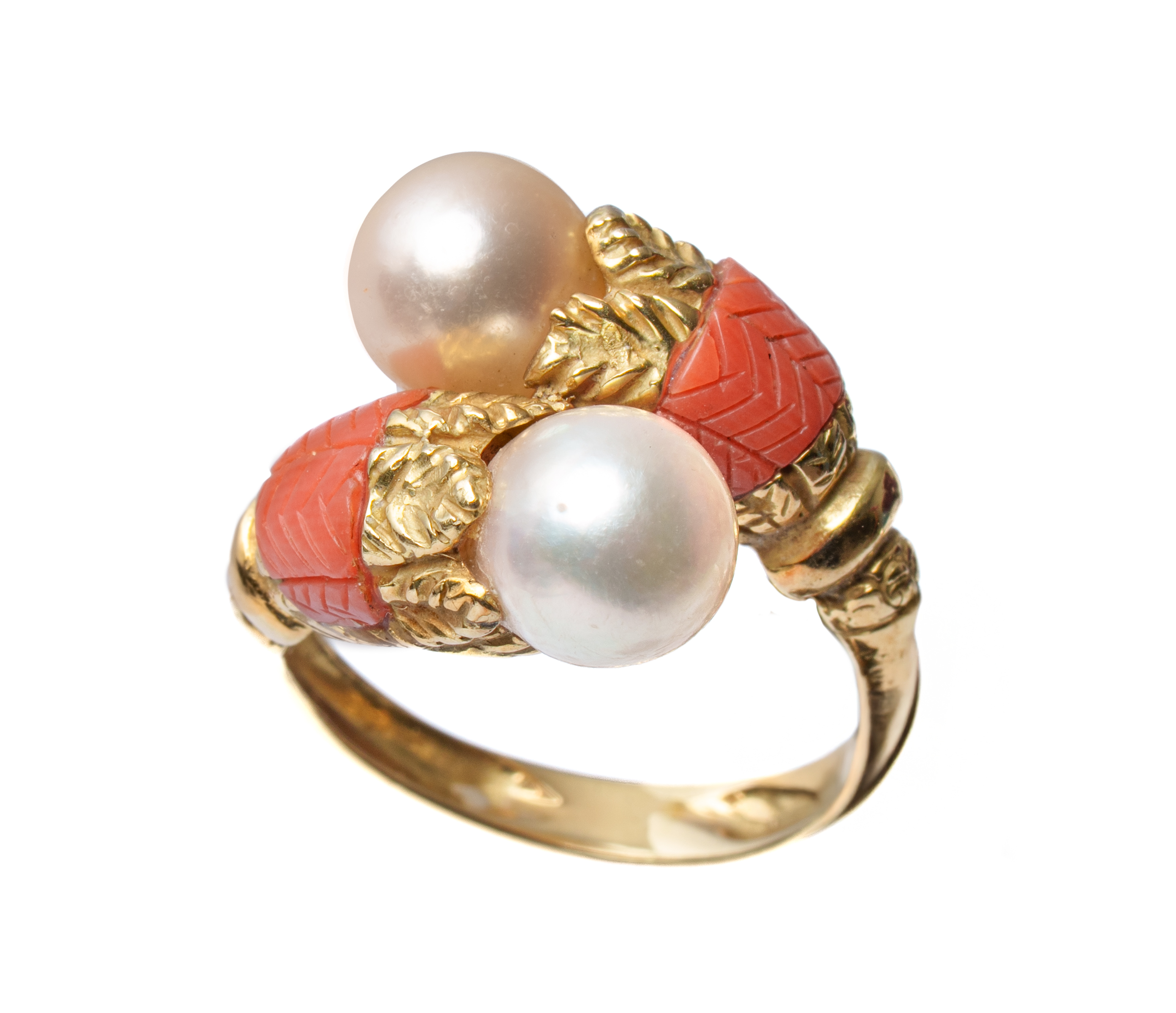 ANELLO in oro giallo 18 KT con due perle Giappone e corallo lavorato (g. 8,50).
