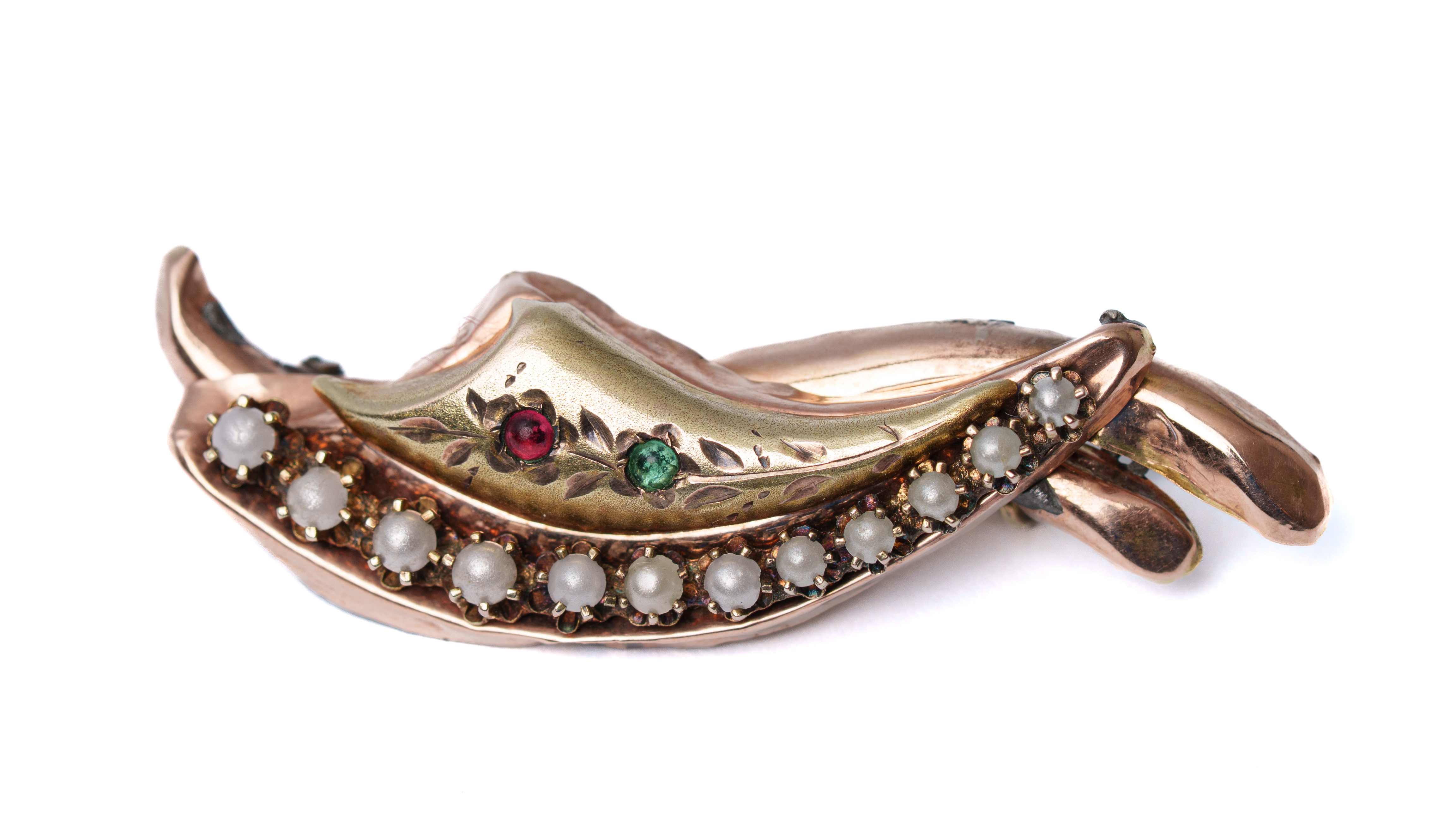 SPILLA in oro giallo 9 KT con rubino, smeraldo e microperline